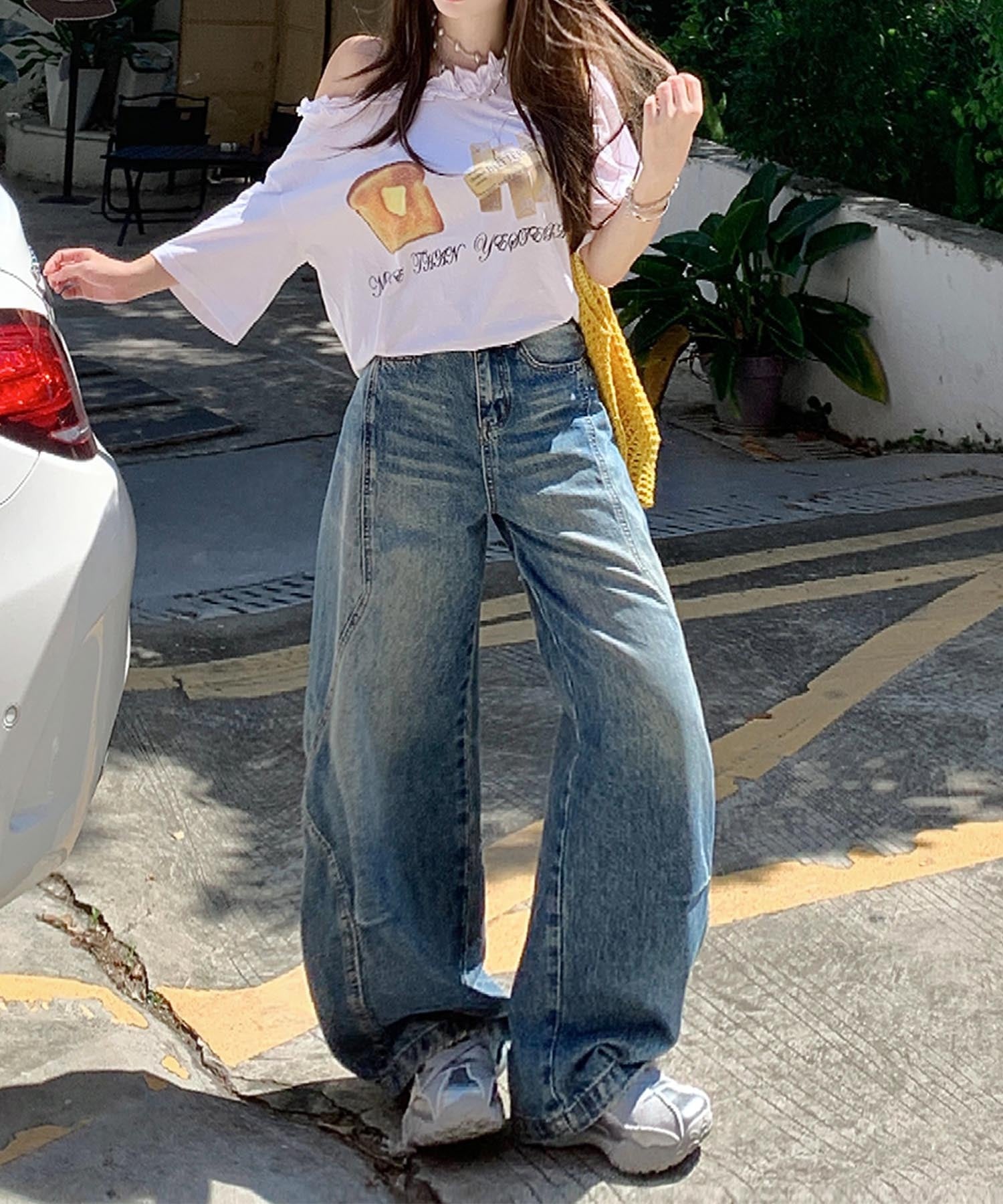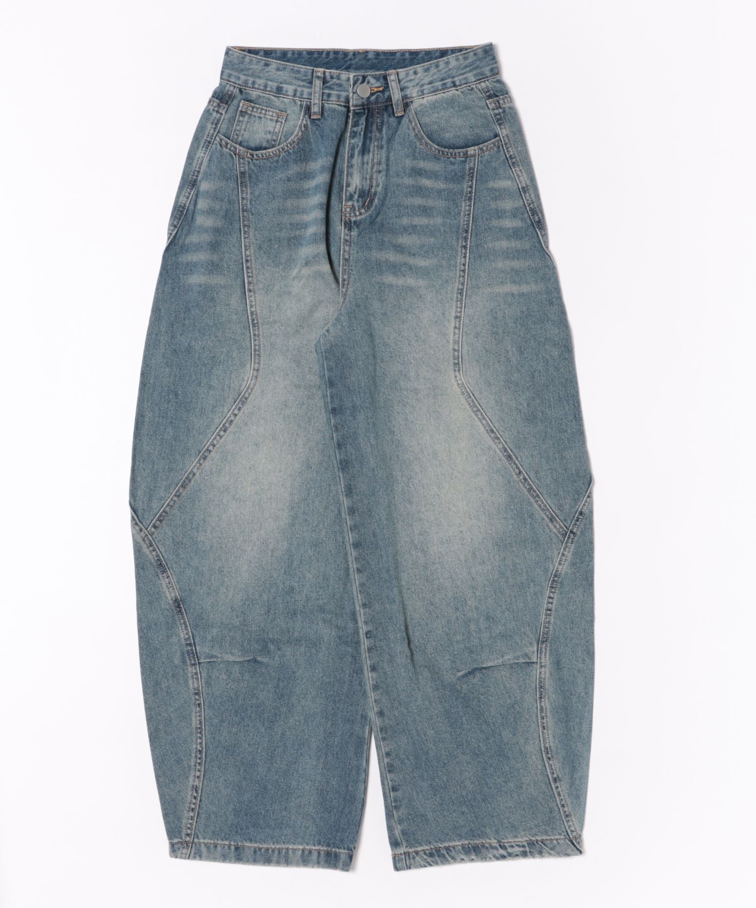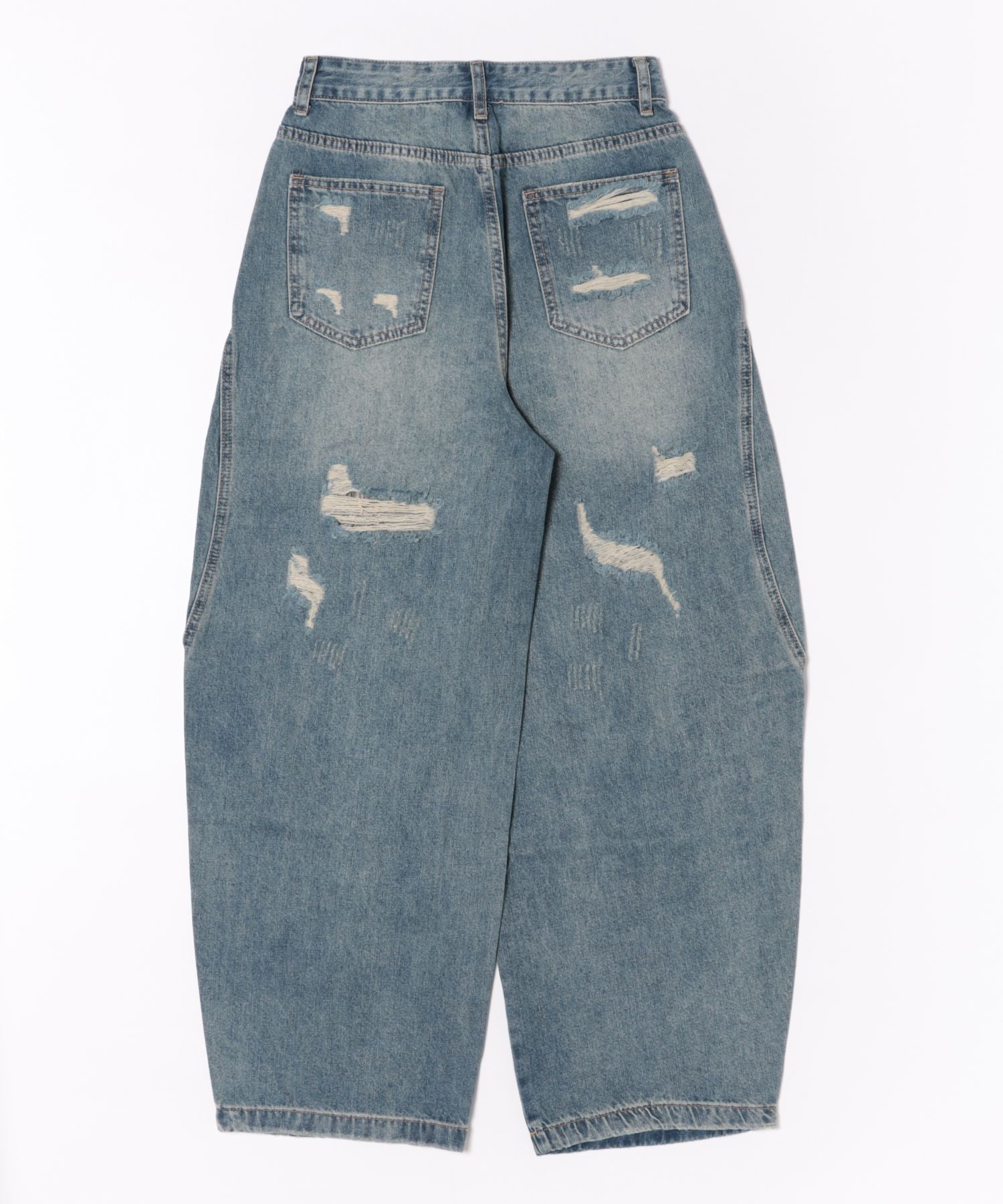 圧倒的な存在感を放つバルーンシルエットと、ダメージ加工が特徴のデニムパンツ。