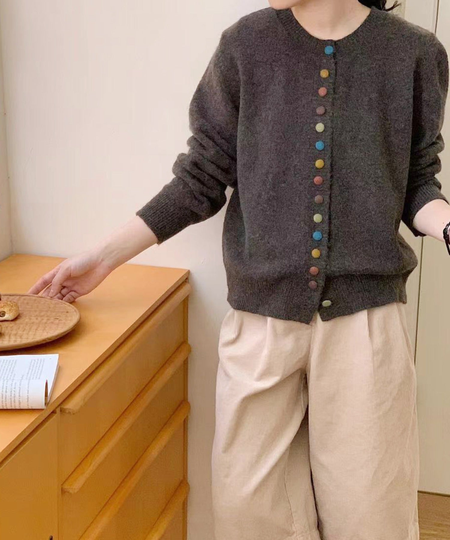 シンプルなデザインにマルチカラーのボタンがアクセントとなったカーディガン。柔らかなニット素材で仕上げており、肌触りが良く、快適に着用できます。ボタンの色が異なることで、さりげないおしゃれ感を演出し、シンプルすぎない洗練された印象に。ベージュ、レッド、グレーなどの落ち着いたカラー展開で、カジュアルからフェミニンまでさまざまなコーディネートにマッチします。デイリー使いからちょっとしたお出かけまで、季節を問わず幅広く活躍するアイテムです。