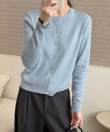 大人のおしゃれを印象付けるデザイン編み柄がポイントのクルーネックニットカーディガン。