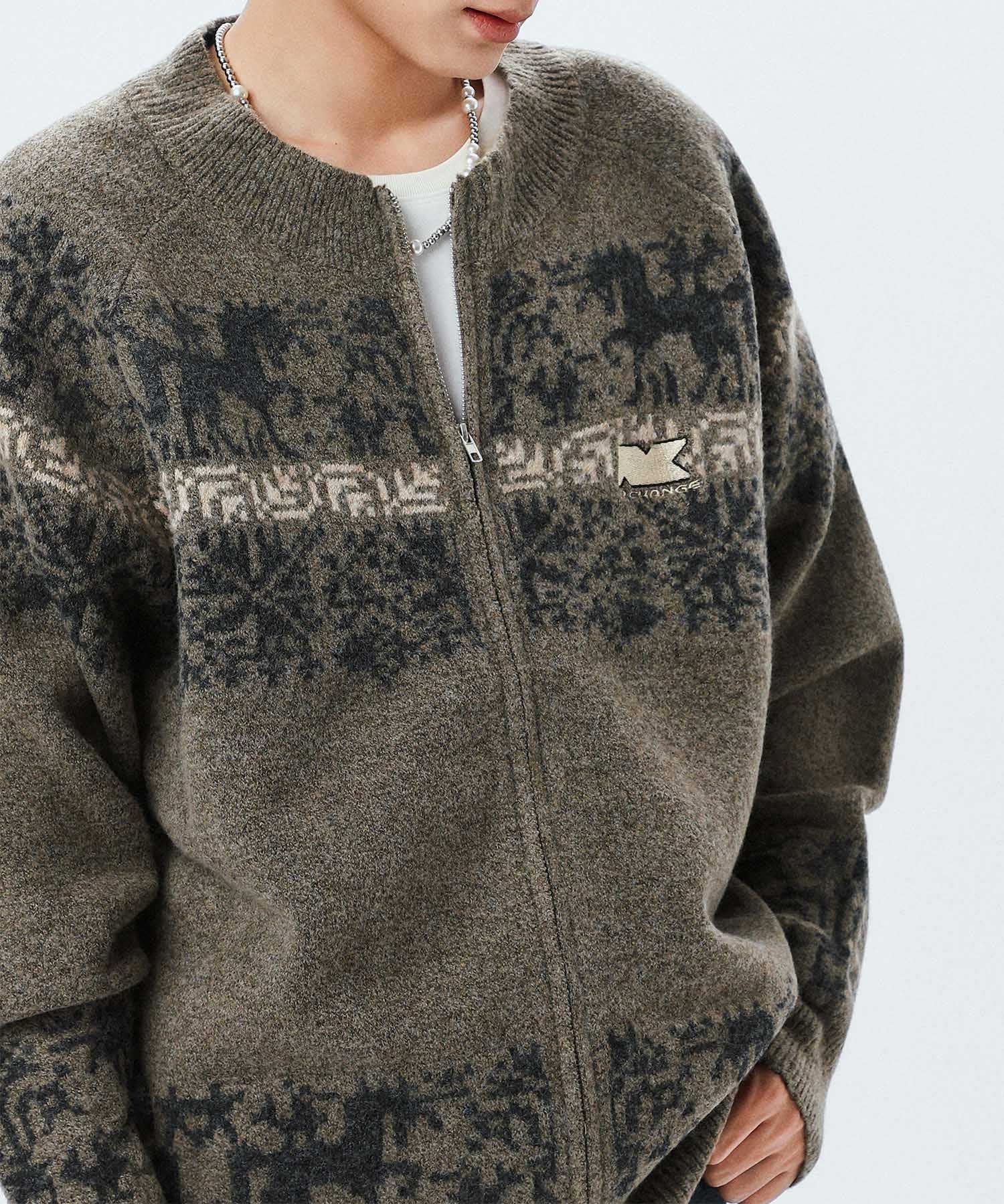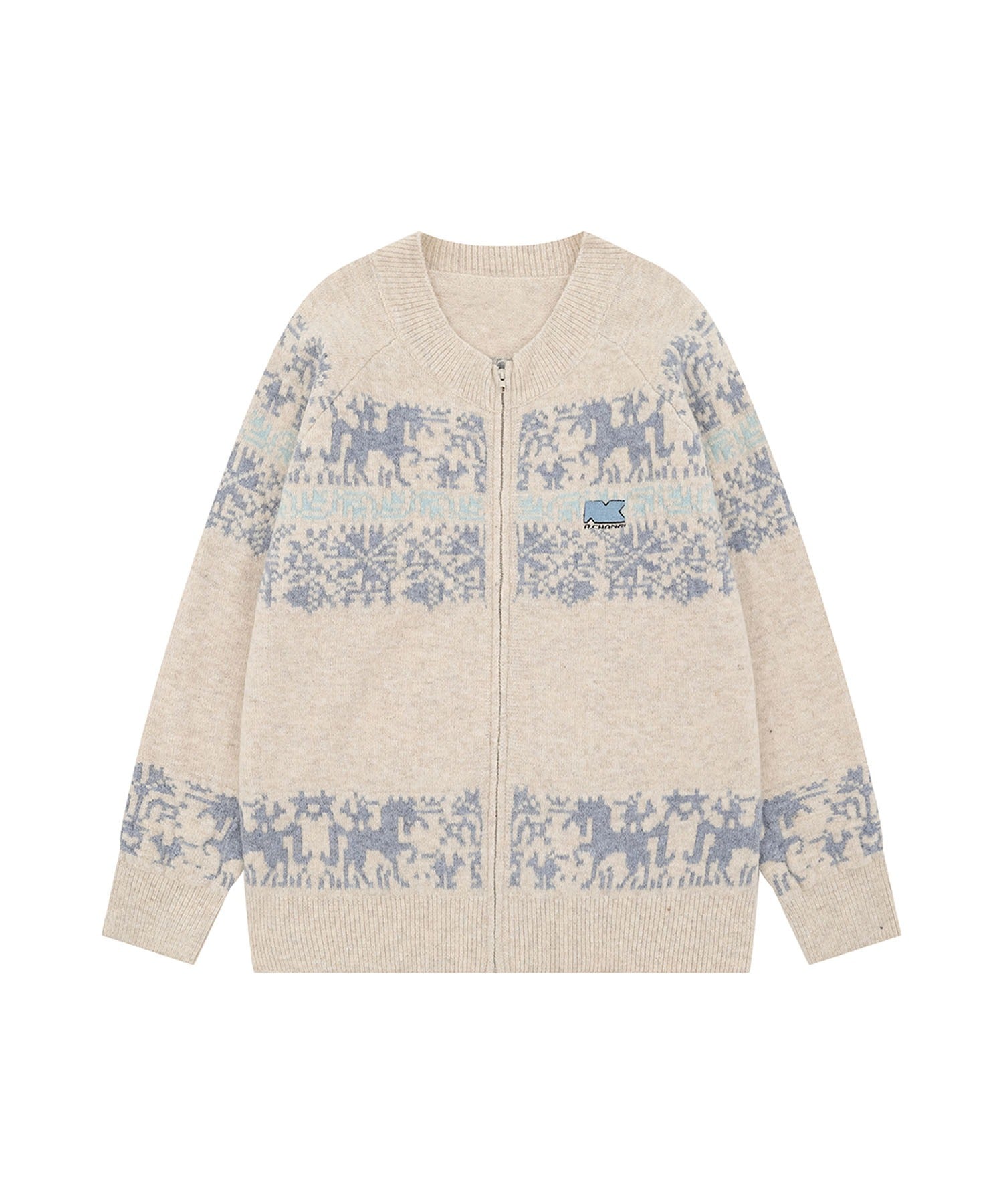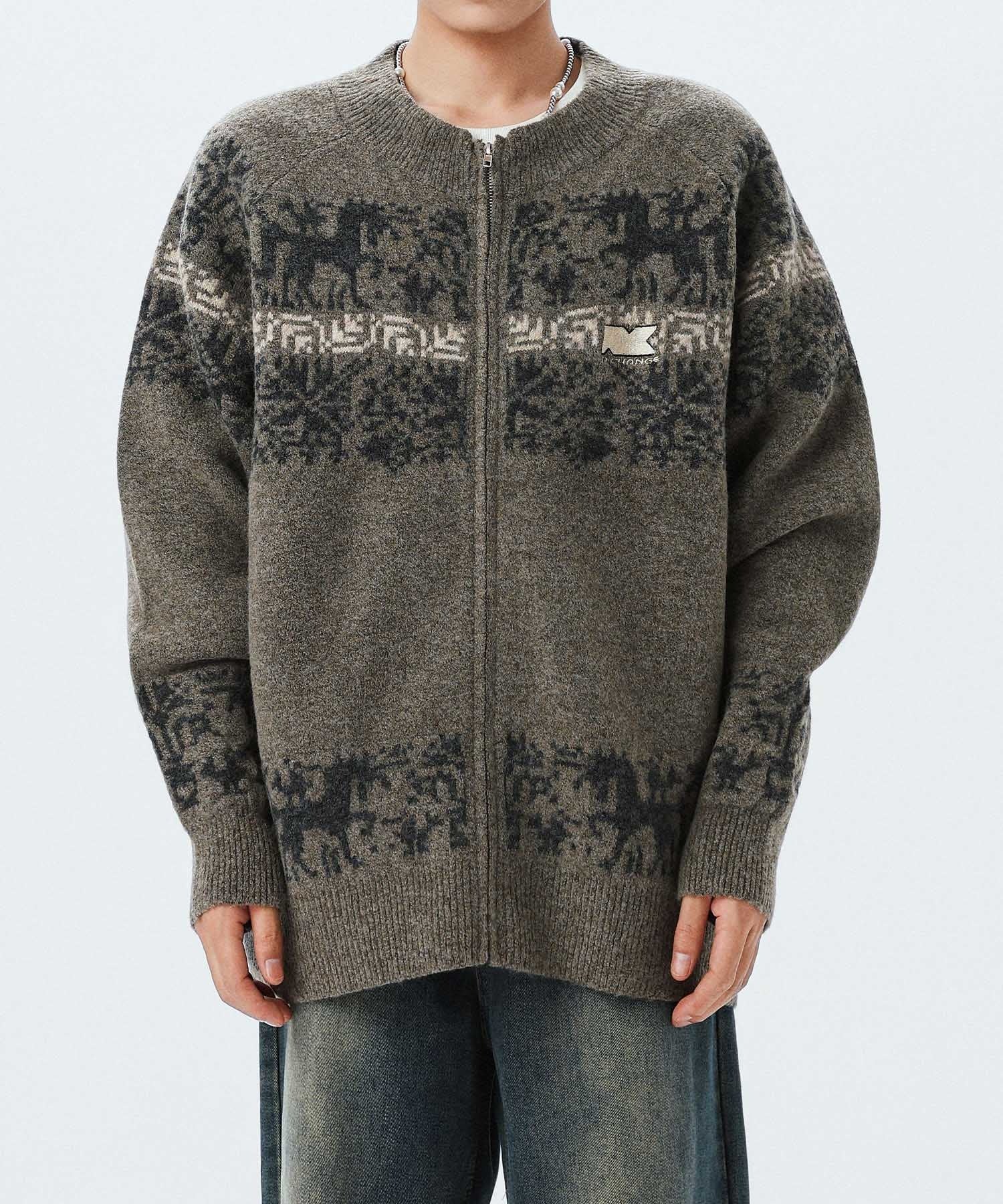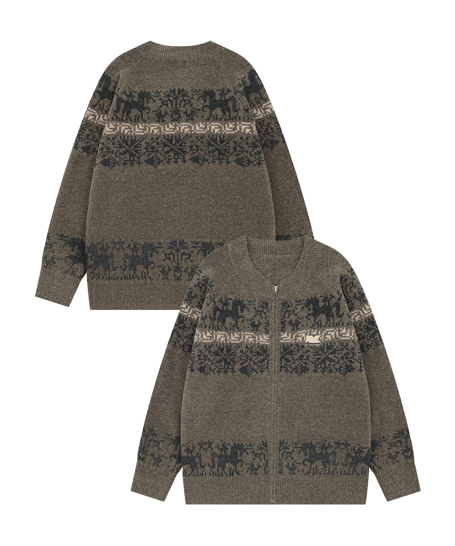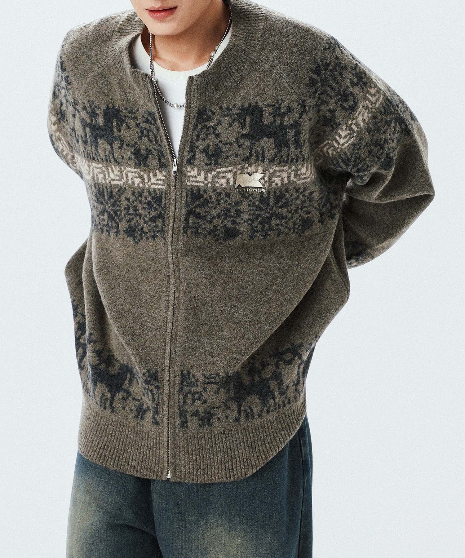 トナカイや動物たちが連なるノルディック風パターンを取り入れた、冬らしいジップアップニットカーディガン。