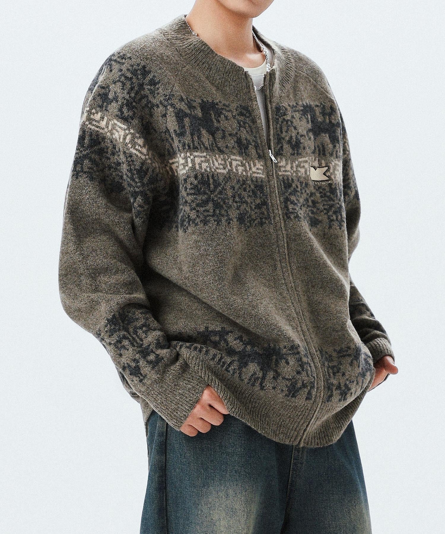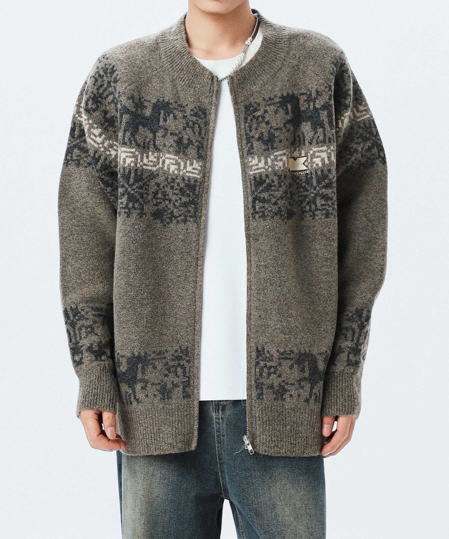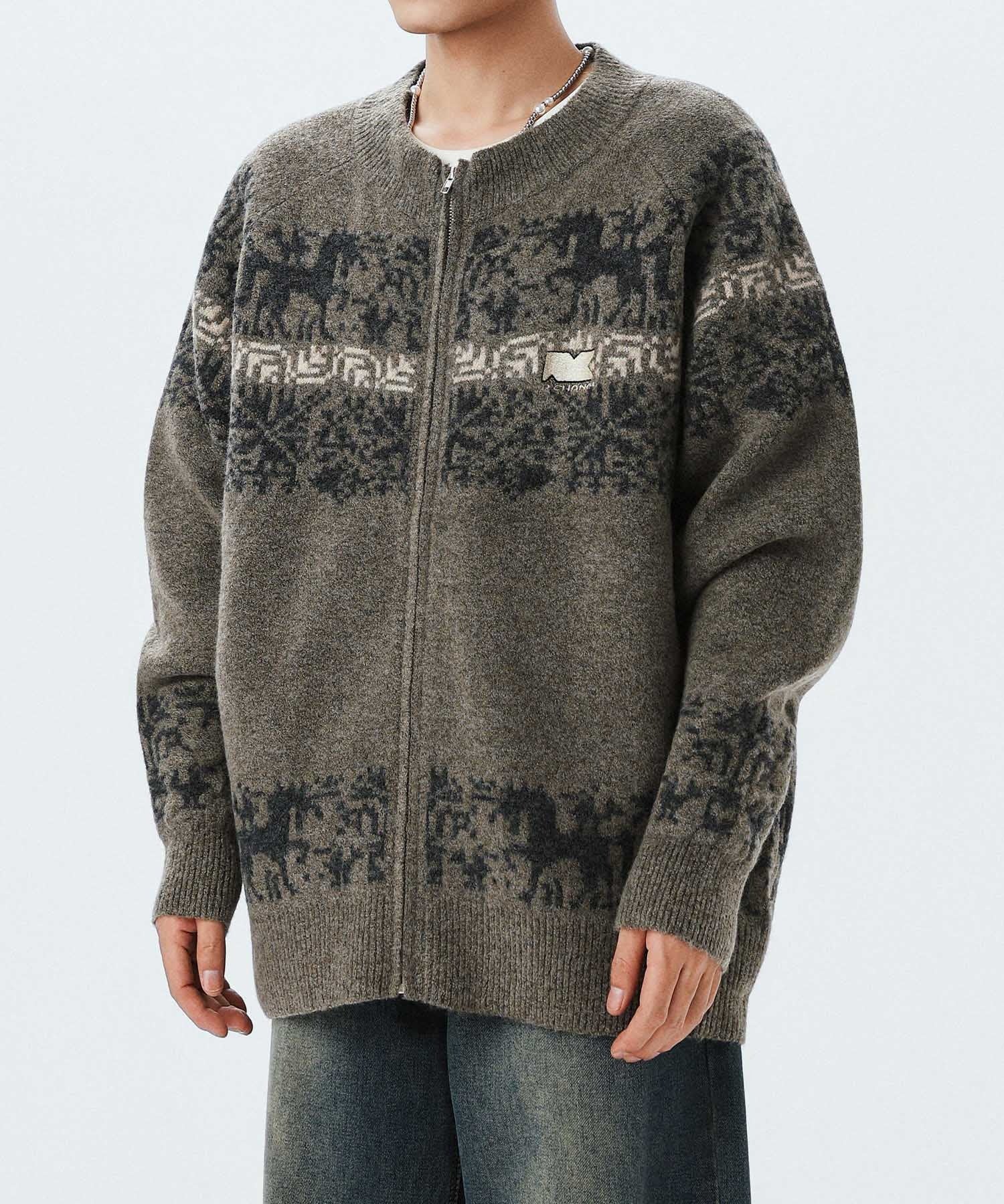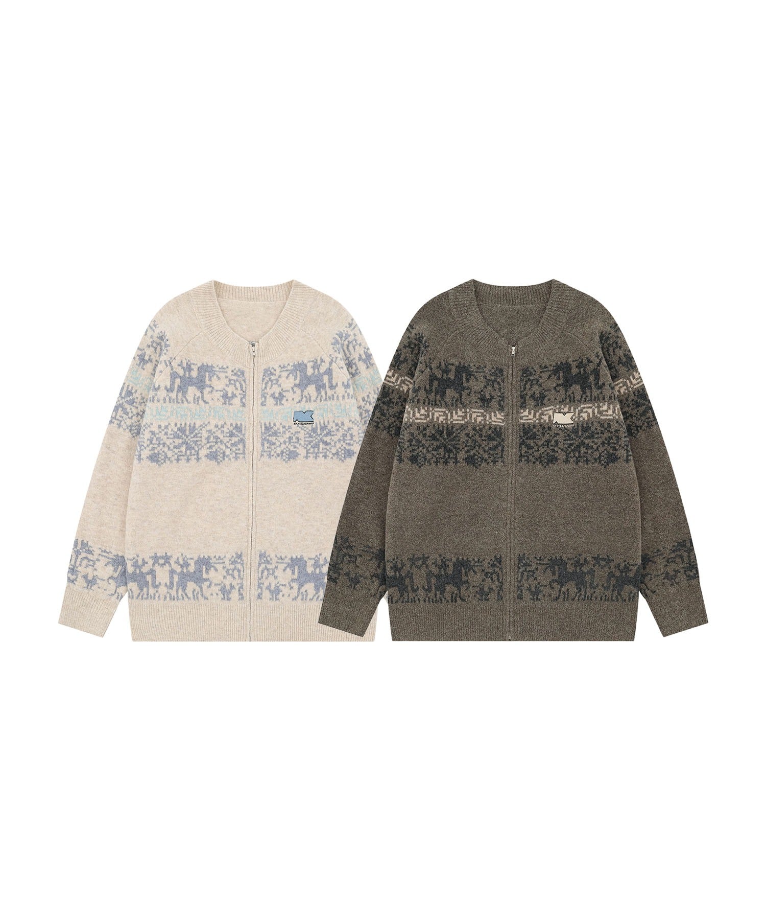 トナカイや動物たちが連なるノルディック風パターンを取り入れた、冬らしいジップアップニットカーディガン。