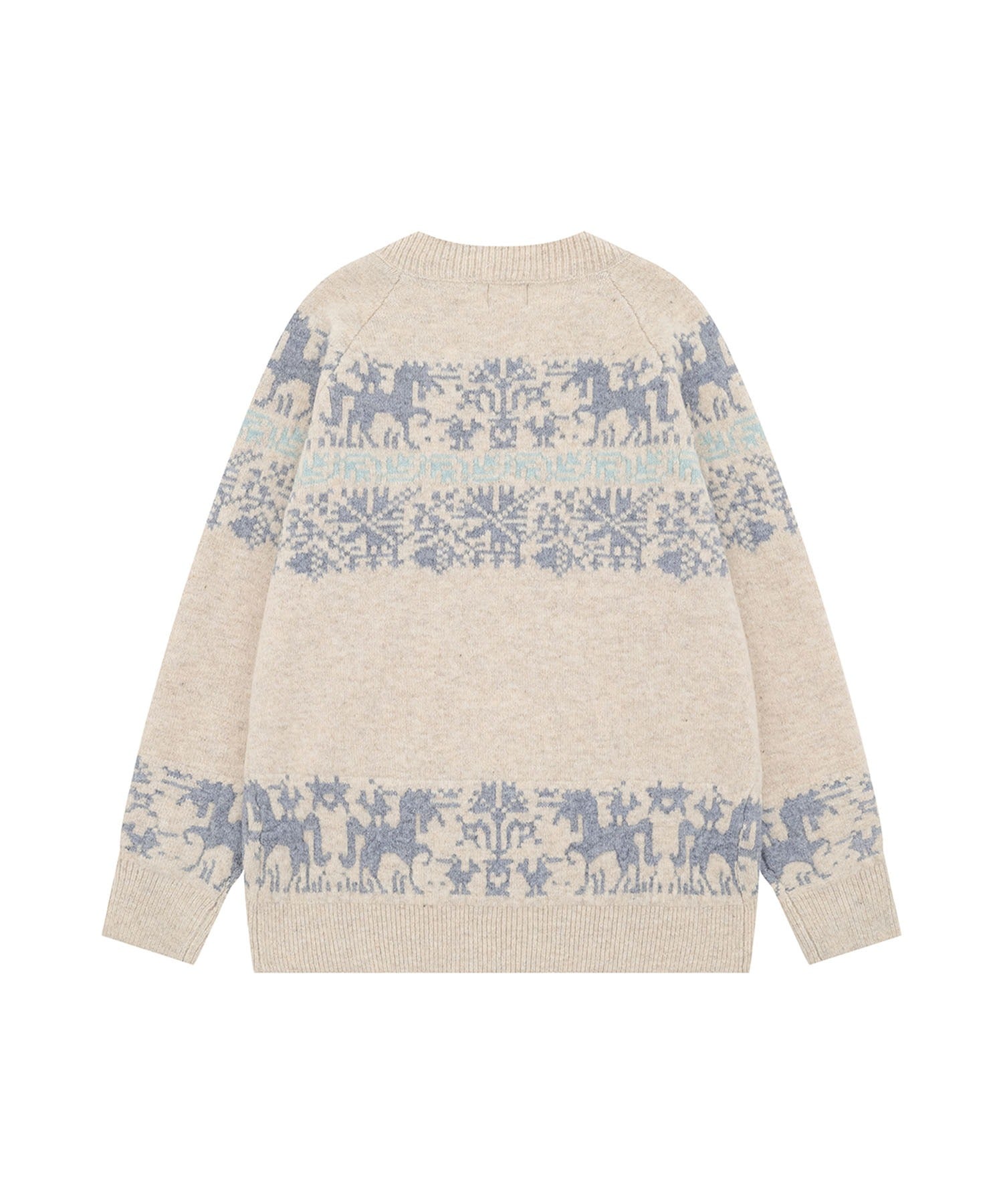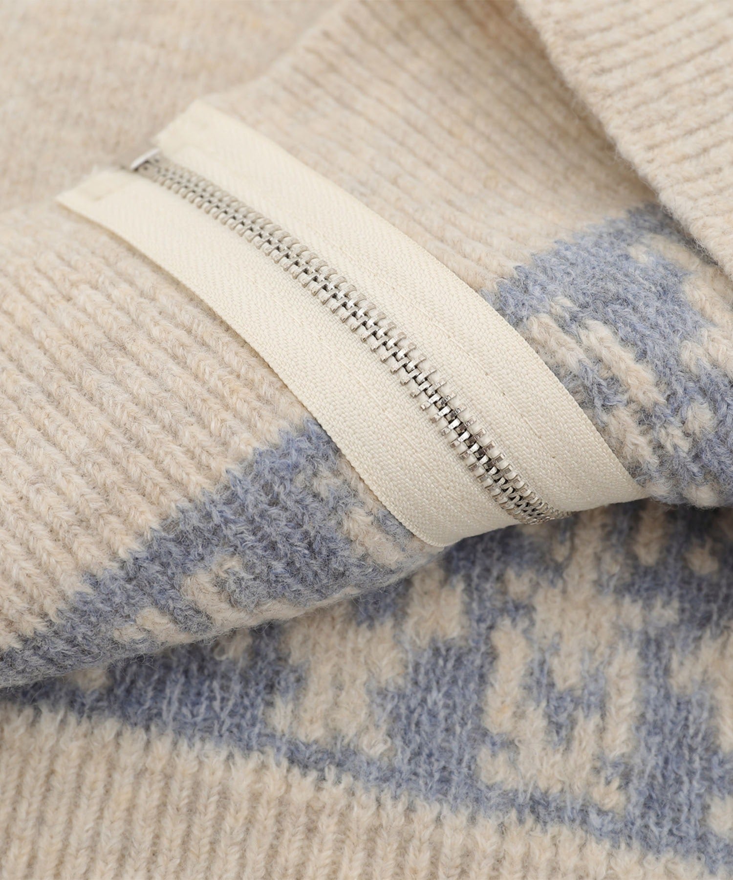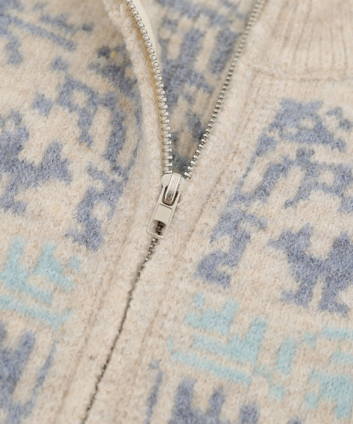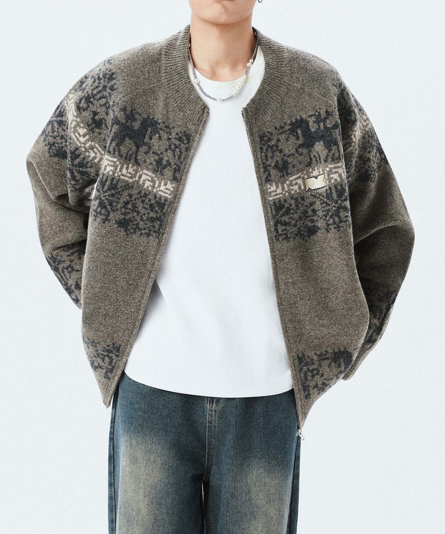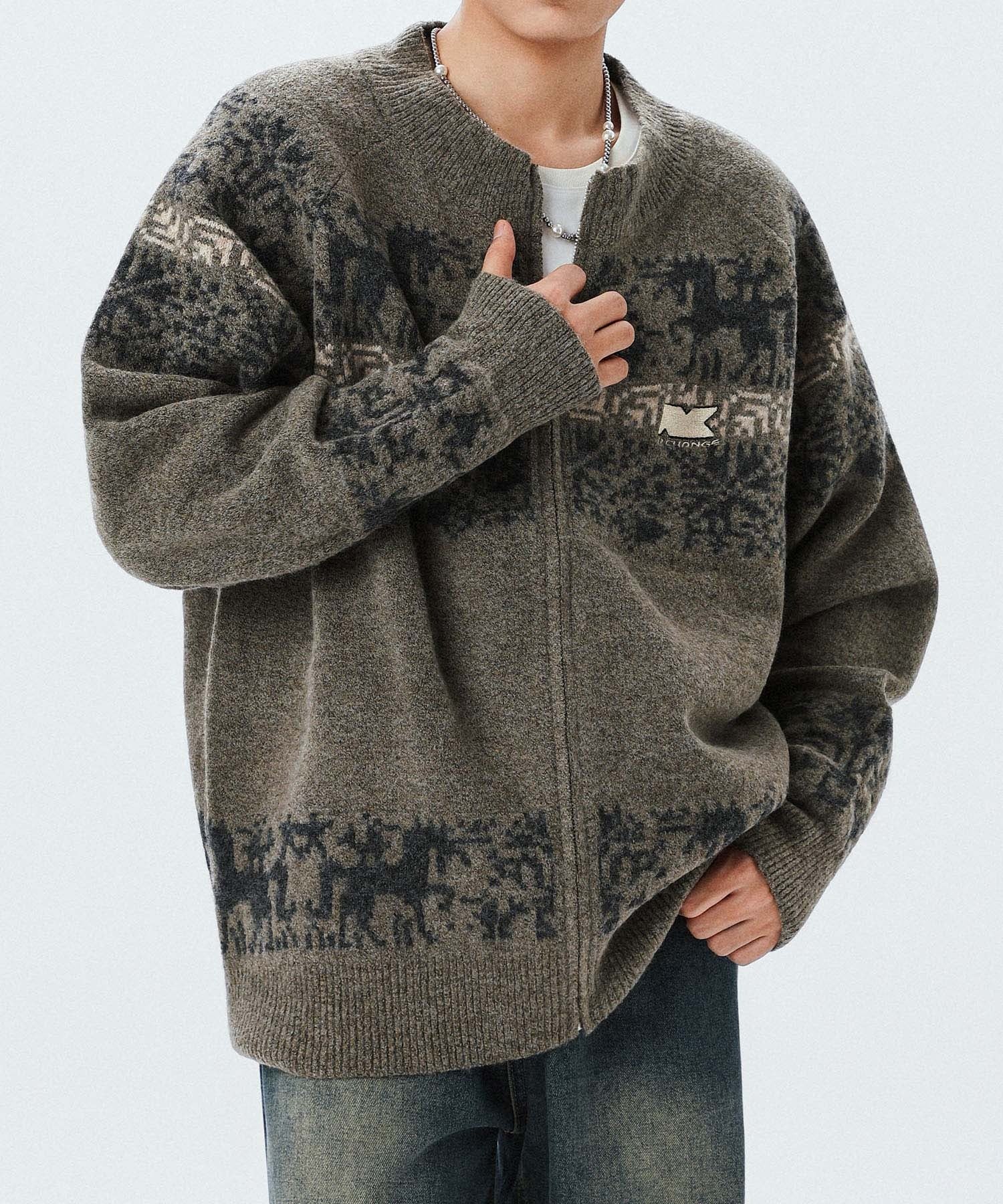 トナカイや動物たちが連なるノルディック風パターンを取り入れた、冬らしいジップアップニットカーディガン。