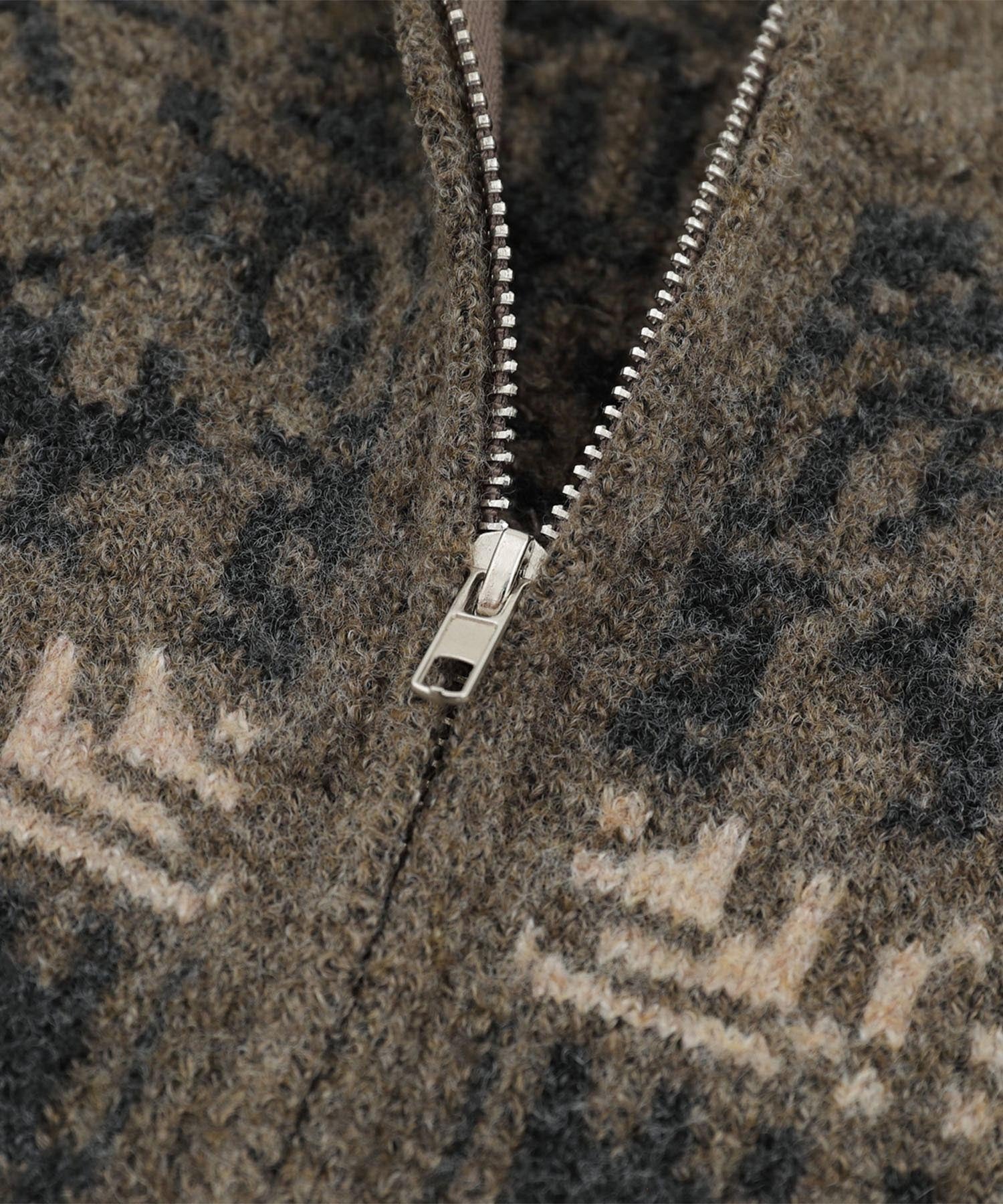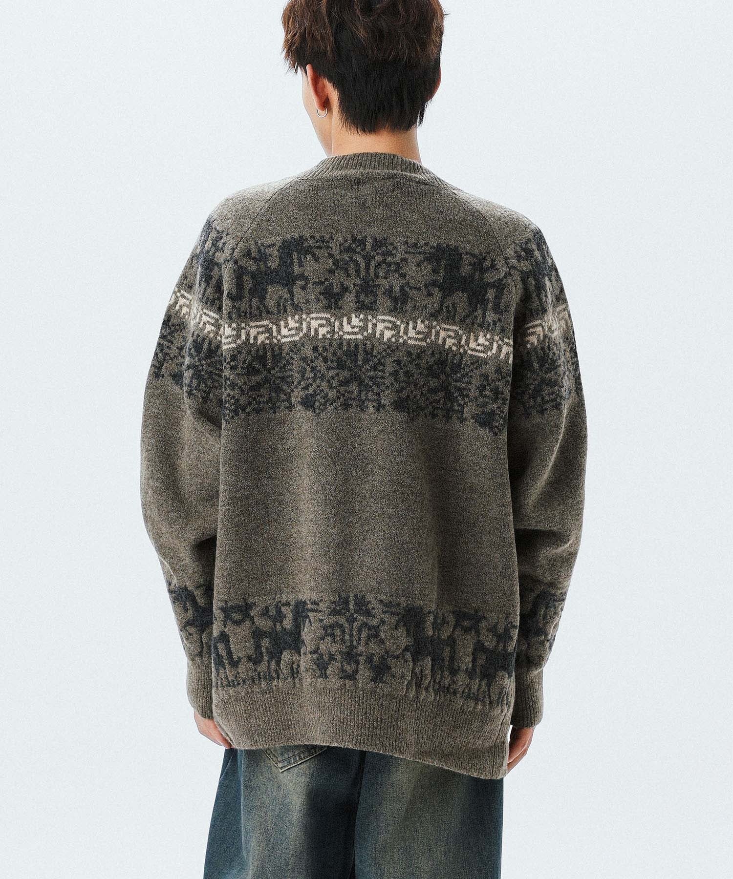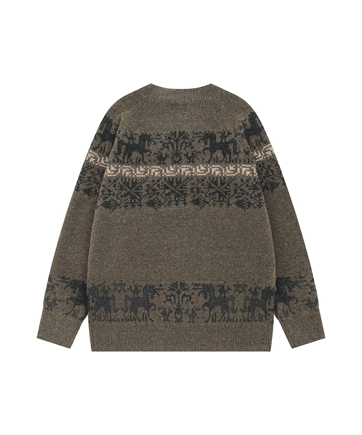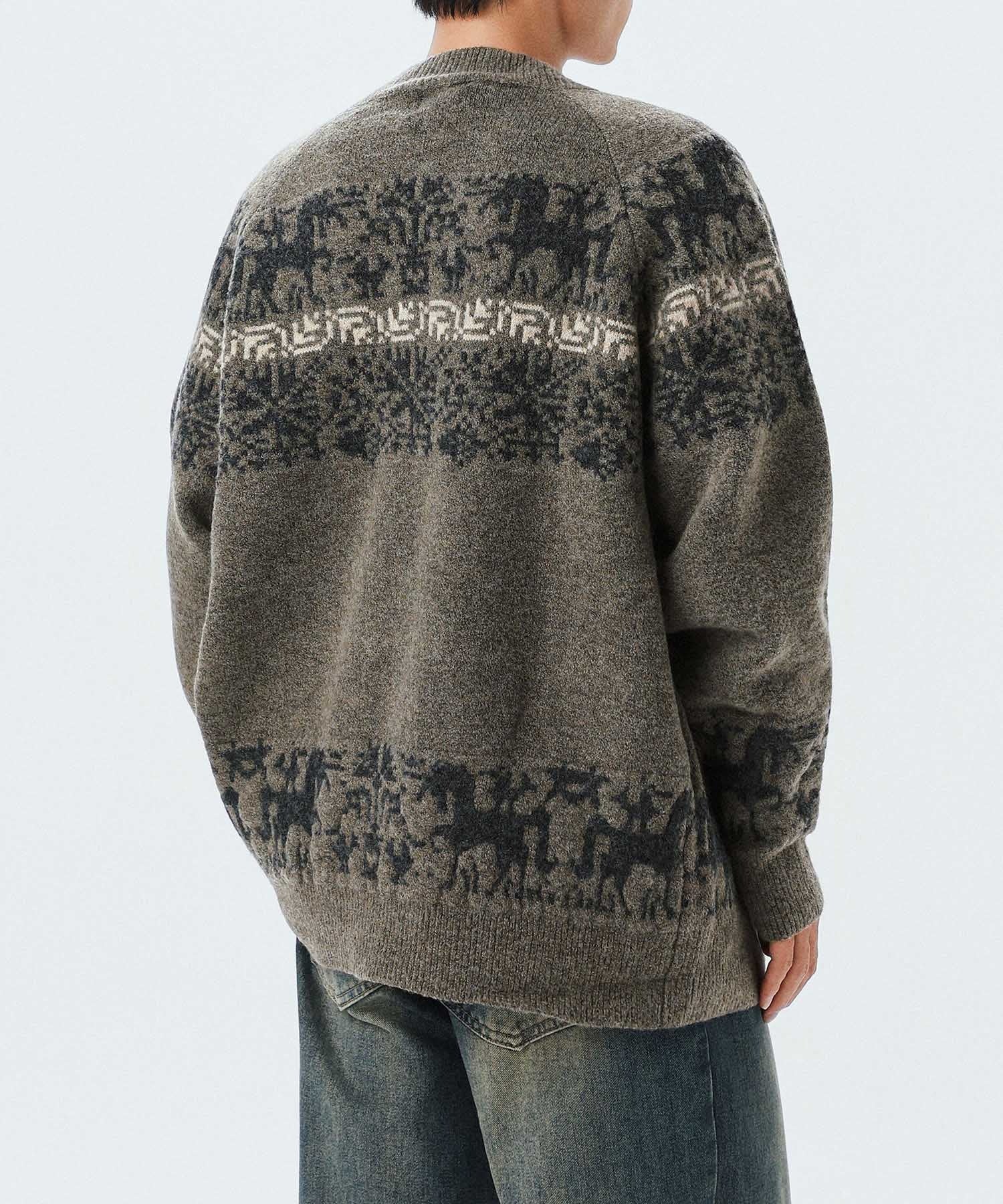 トナカイや動物たちが連なるノルディック風パターンを取り入れた、冬らしいジップアップニットカーディガン。