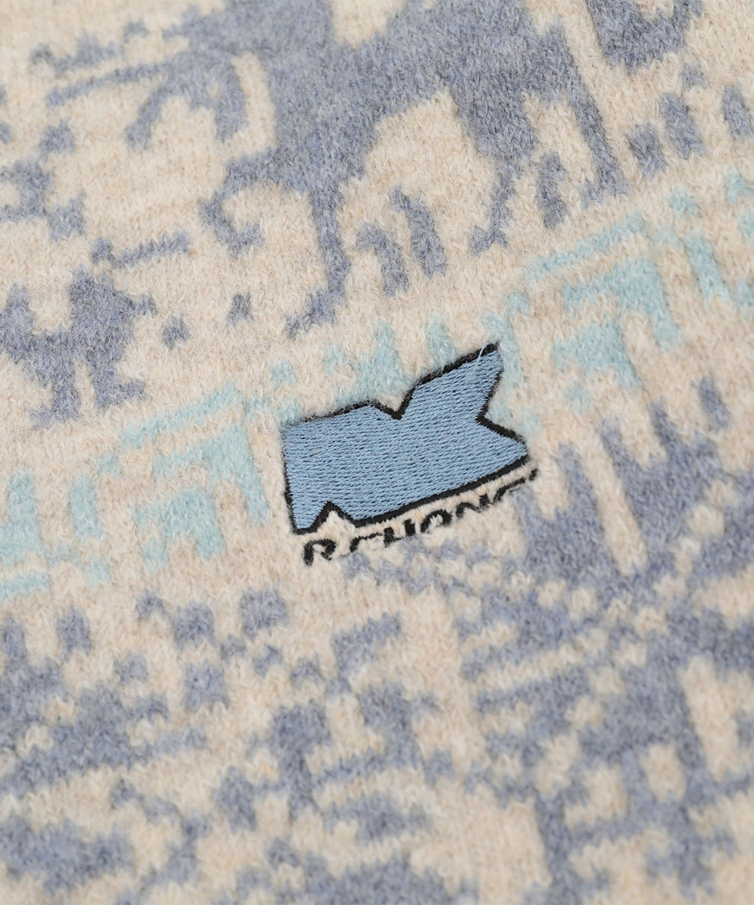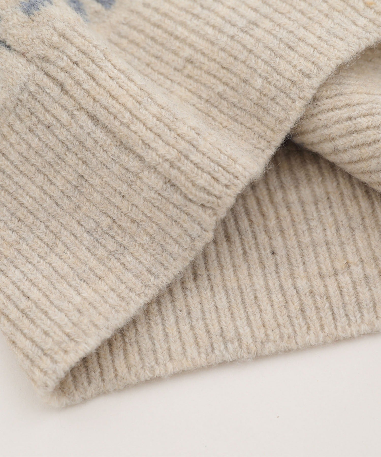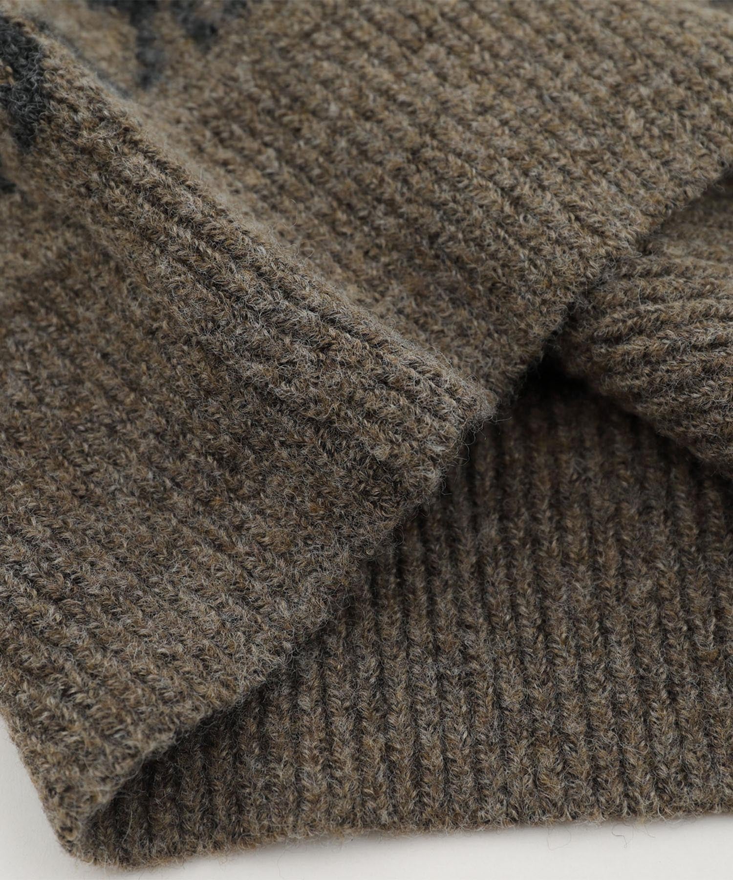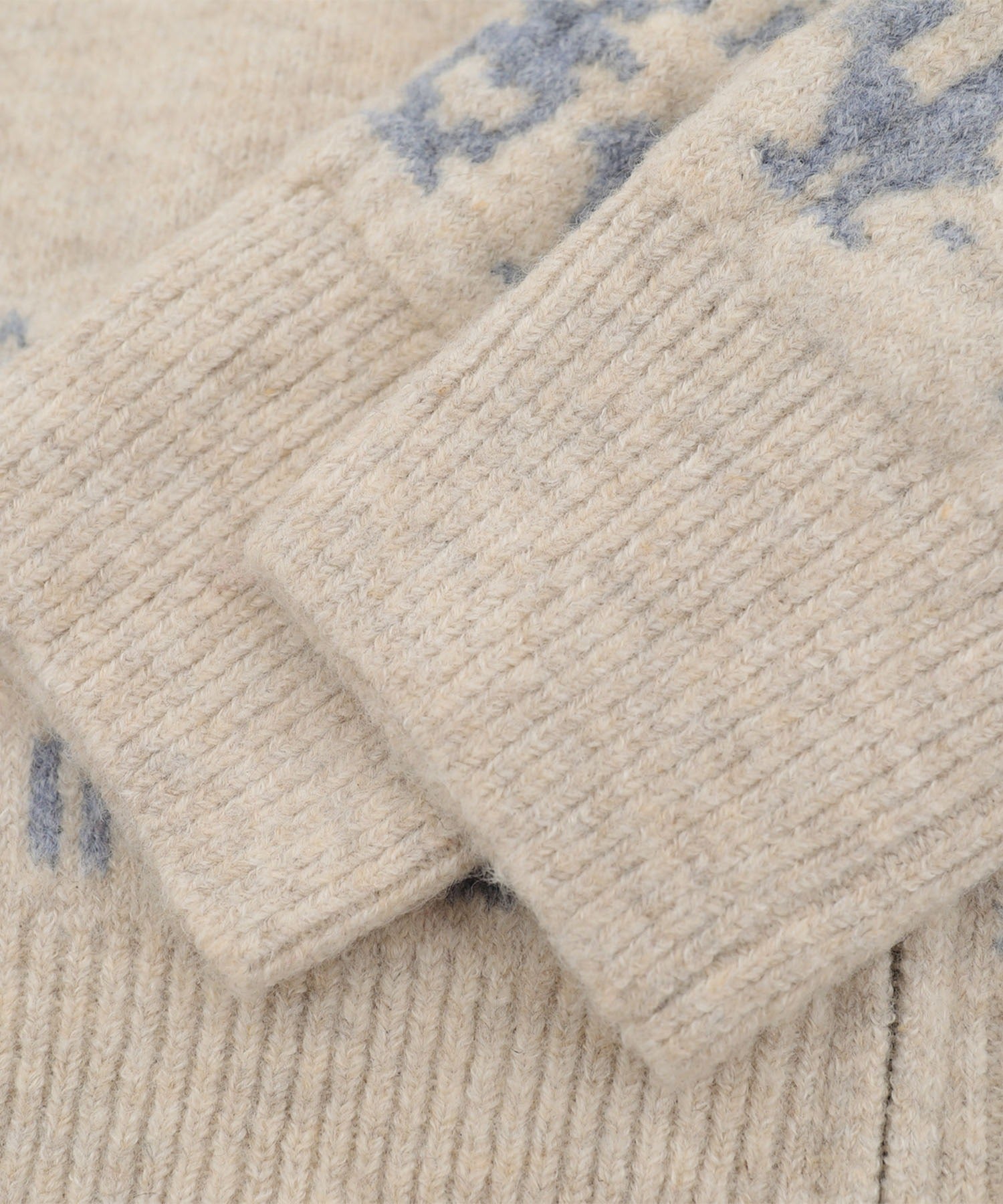 クラシックなフェアアイル調の編み柄に、胸元の小さな刺繍ワッペンがポイントになったデザインです。
