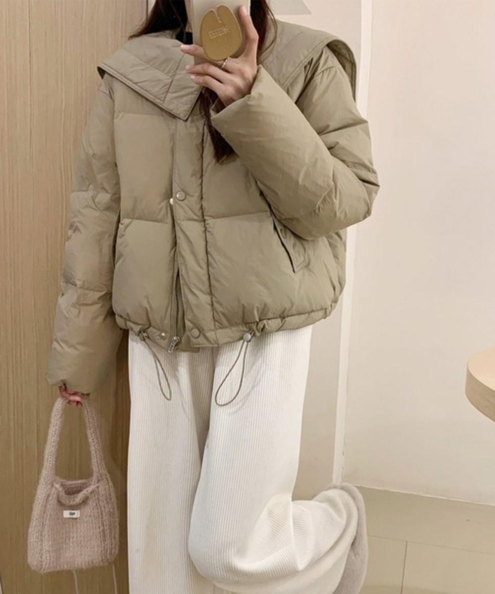 ■デザイン * 大きめなセーラーデザインがポイントのダウンジャケット。シンプルながらも個性的な印象を与えます。裾はトレンドライクなドロストデザインになっており、お好みのシルエットに調節が可能です。