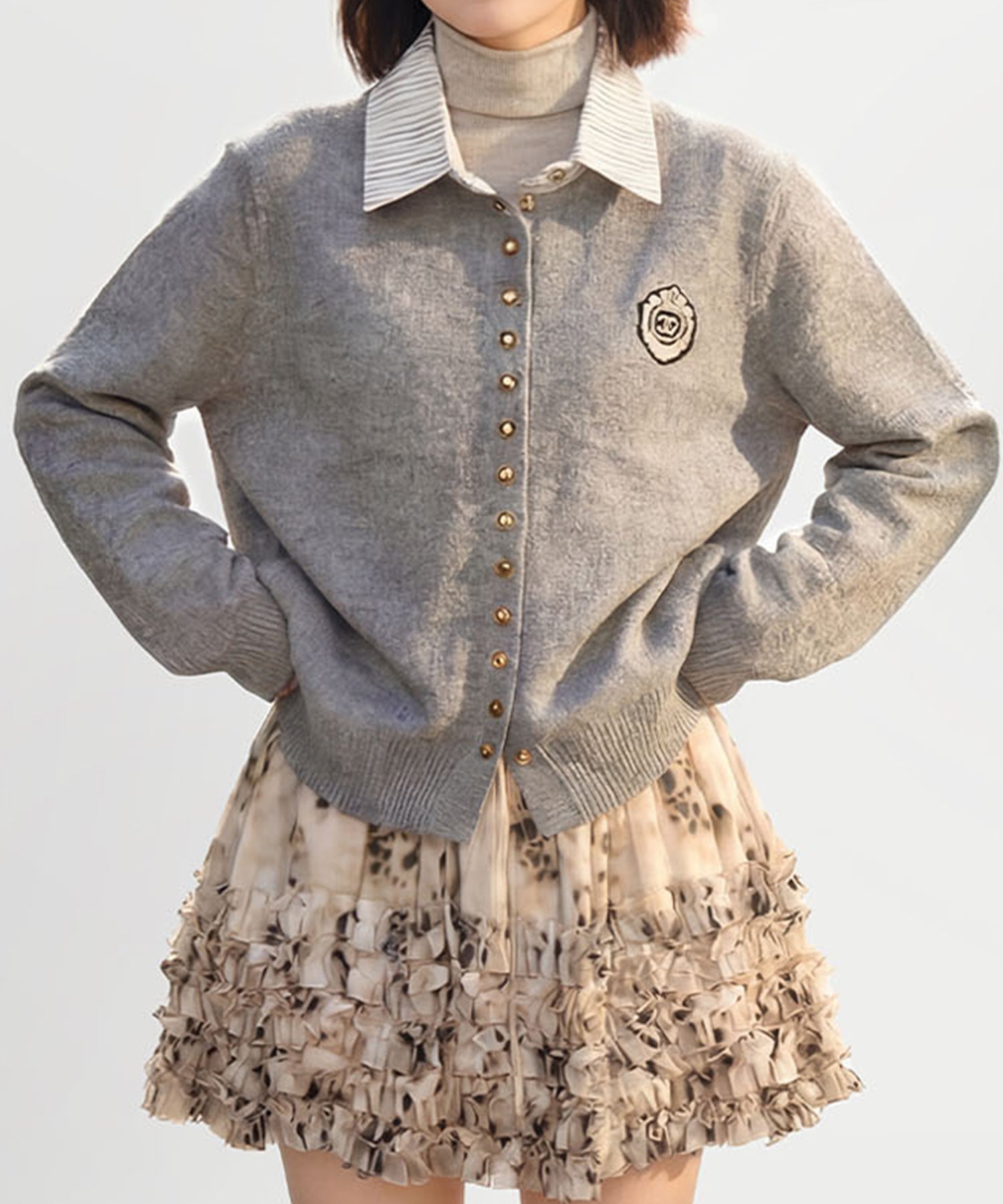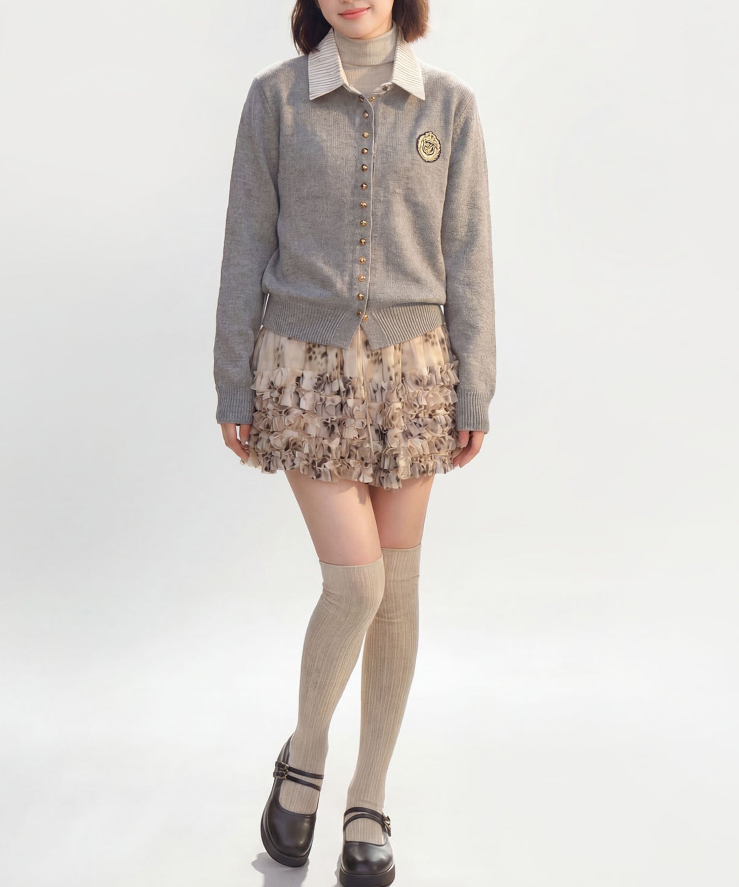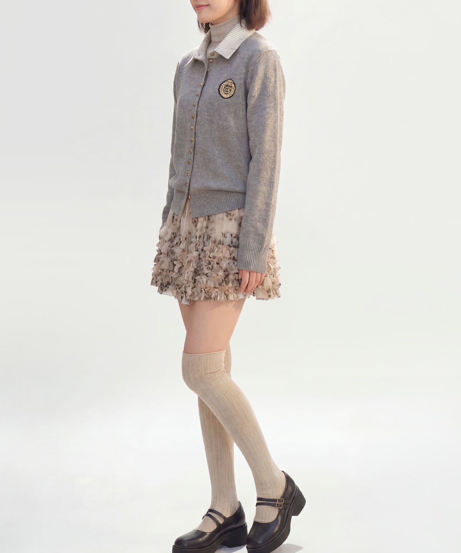 胸元にはクラシカルな刺繍ワッペン(エンブレム)がアクセントになり、ガーリーさとスクールライクな雰囲気を両立。