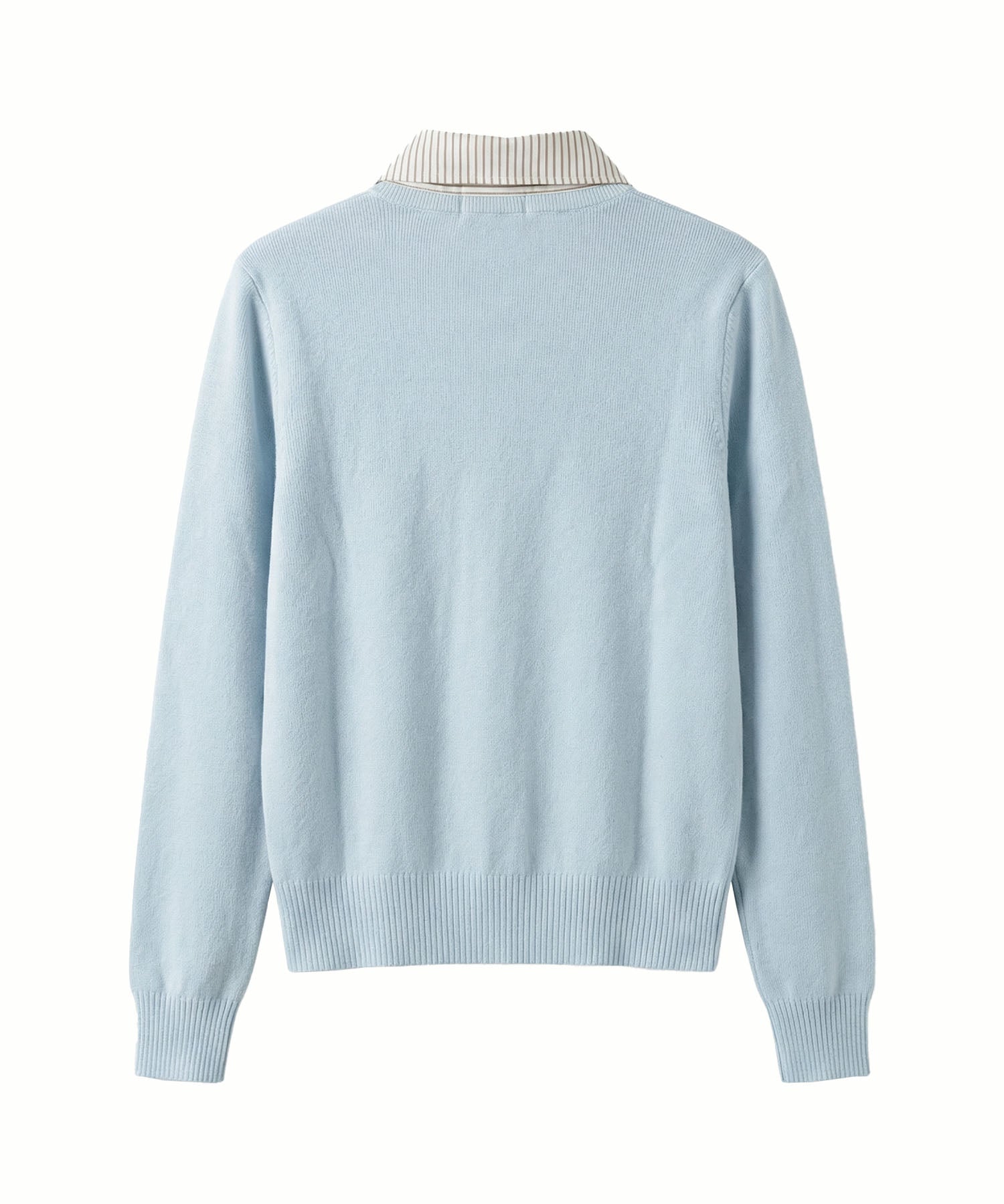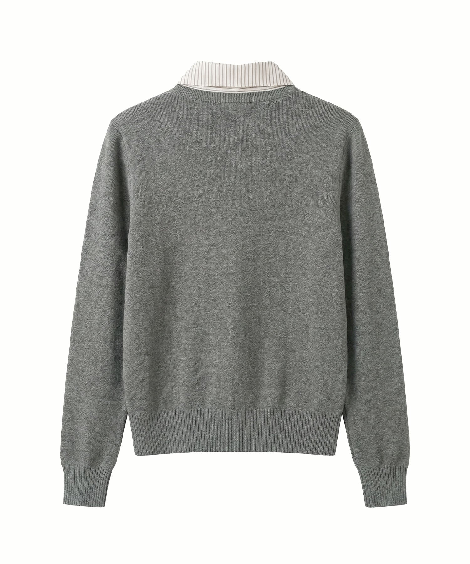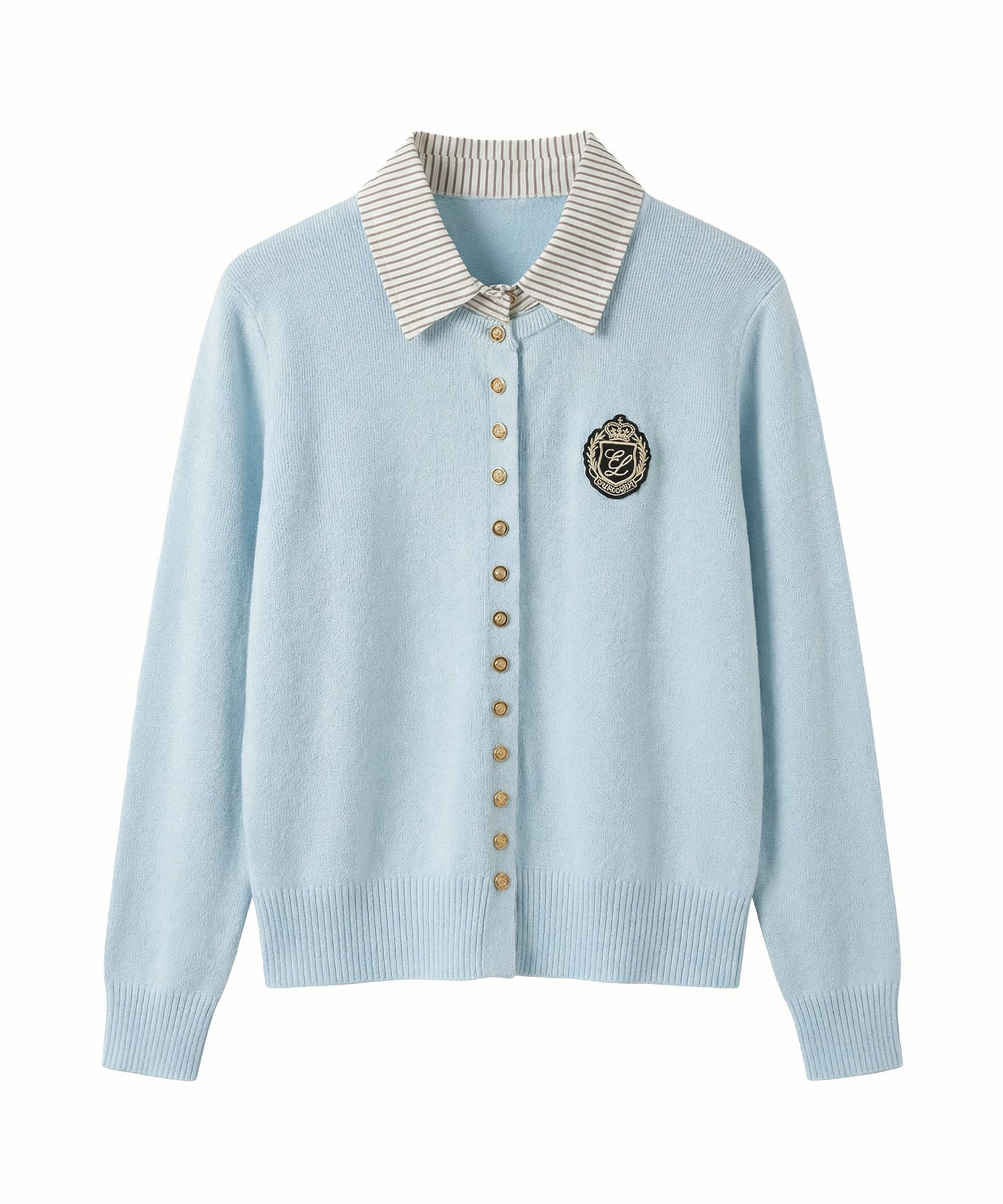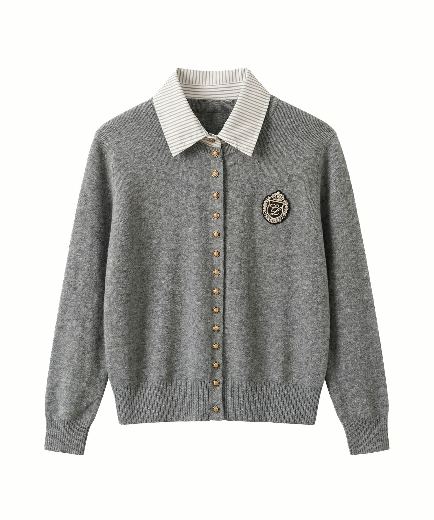 ストライプ柄のシャツ襟が付いた、上品なプレッピー感漂うエンブレムカーディガン。