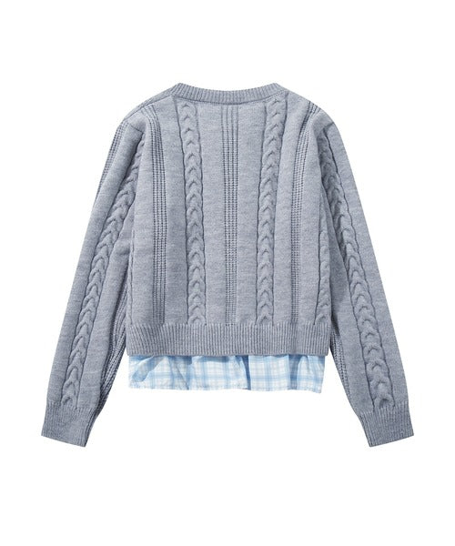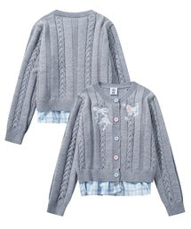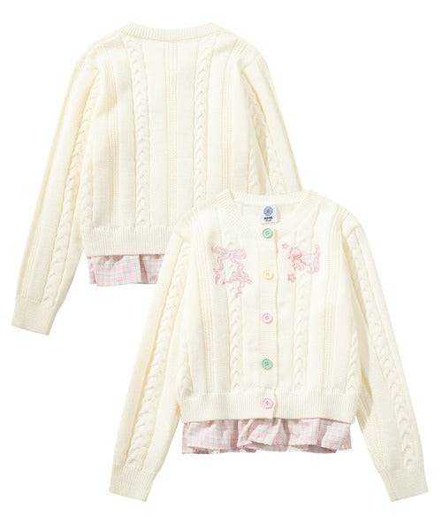 HOOK for girls 刺繍リボン ケーブルニットカーディガン 裾チェック切替 レイヤード風