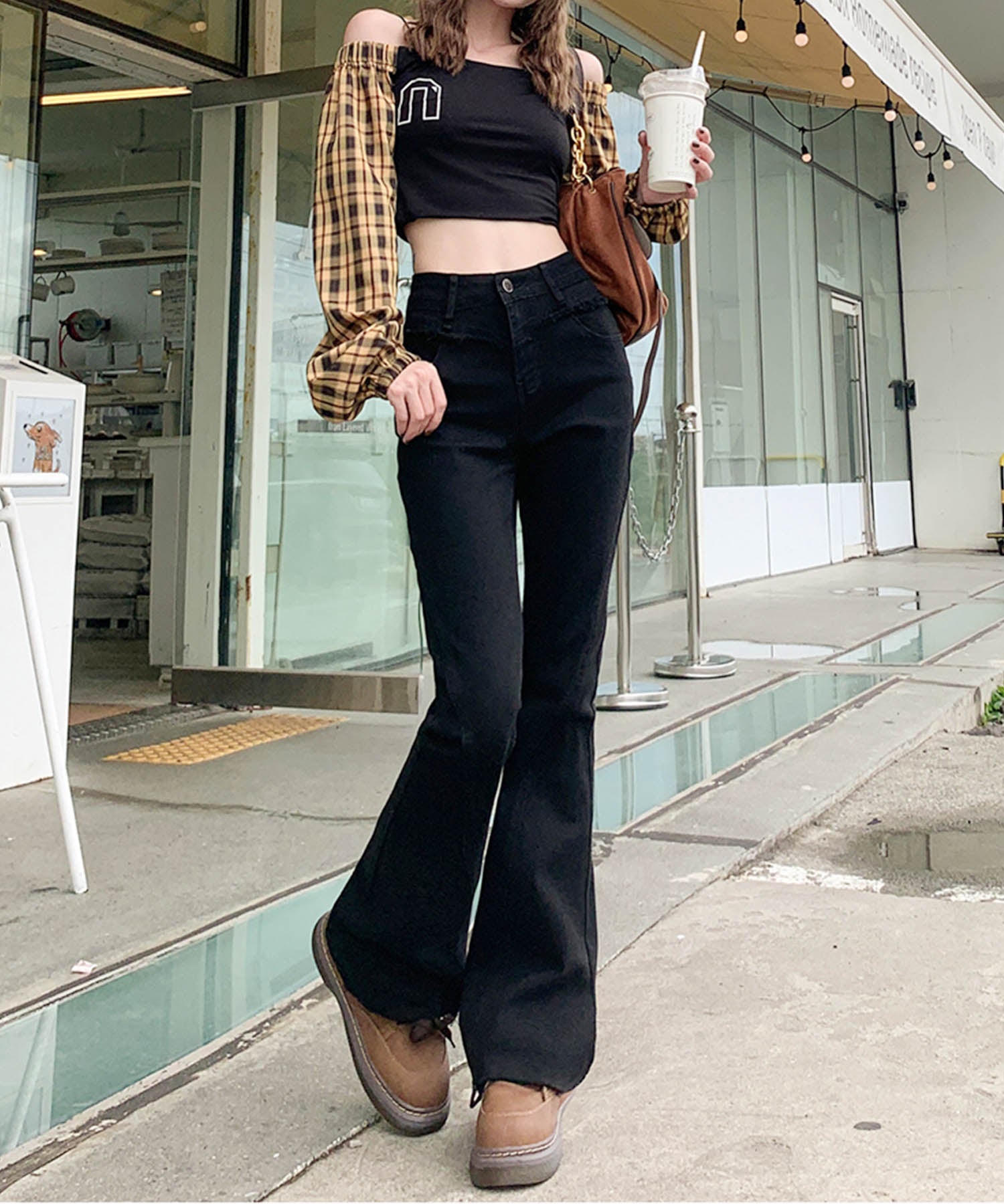 美脚効果抜群のブーツカットデニムパンツが登場!程よいフィット感から裾に向かって広がるブーツカットシルエットが、脚を長くスラリと見せてくれます。カジュアルなヴィンテージブルーとシックなブラックの2色展開で、デイリーからフォーマルまで幅広く活躍します。