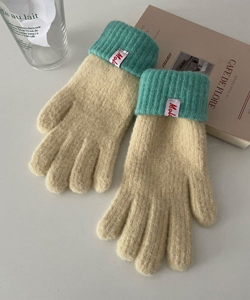 • デザイン:鮮やかな色使いとバイカラーの配色が独創的で、手元を華やかに彩ります。リブ編みのカフ部分が異なる色でデザインされており、個性的で目を引くスタイルです。