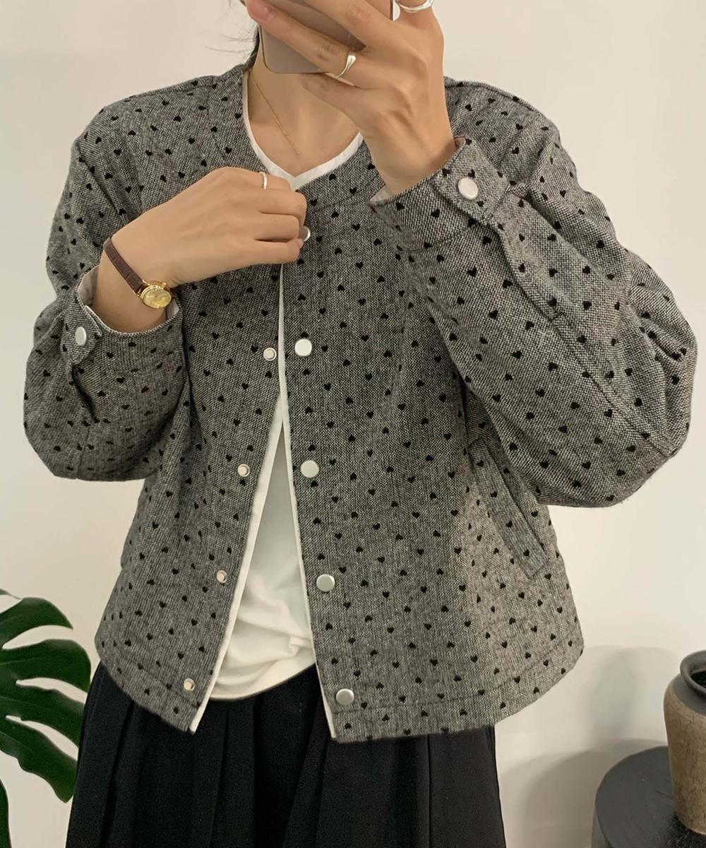 落ち着いた色味とドット柄が調和したコットンジャケット。ノーカラーデザインで、すっきりとした首元が魅力的です。フロントボタン仕様で着脱が簡単。シンプルながらも上品な雰囲気が漂い、カジュアルにもきれいめスタイルにも合わせやすい万能アイテムです。