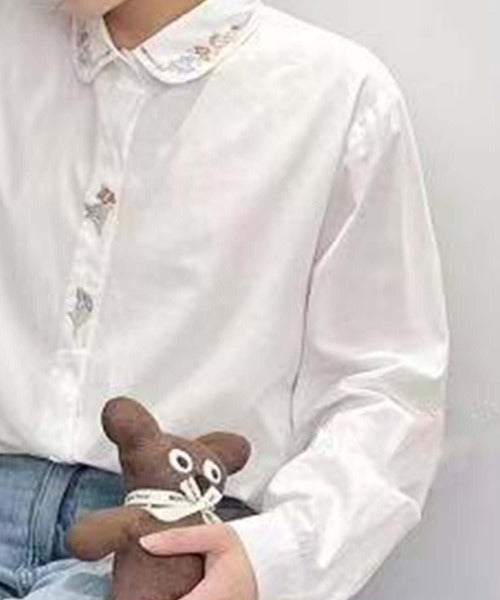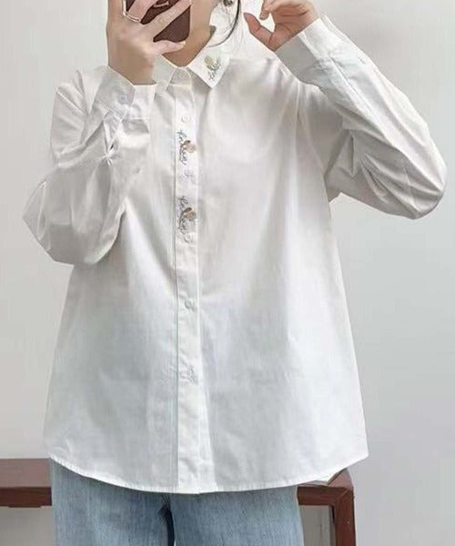 襟とリラックス前立てに刺繍があしらわれた長袖シャツです。ゆったりとしたシルエットで、着心地のある。刺繍がアクセントになり、シンプルなデザインながらも、おしゃれな印象を与えてくれます。