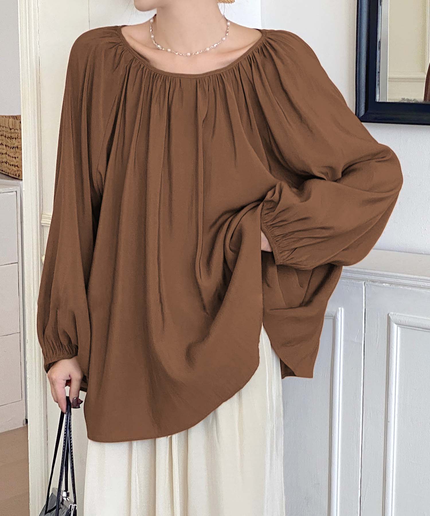 シンプルながらも胸元のリボンがアクセントになっているブラウス。スキッパーデザインにリボンがついた抜け感のある表面と、シンプルで飽きのこないの裏面の前後2wayデザイン仕様。ゆったりとしたシルエットは、しっかりと二の腕やお腹まわりをカバーしてくれます。