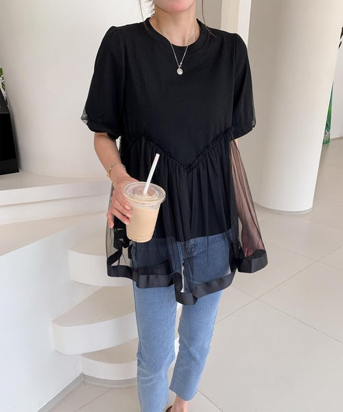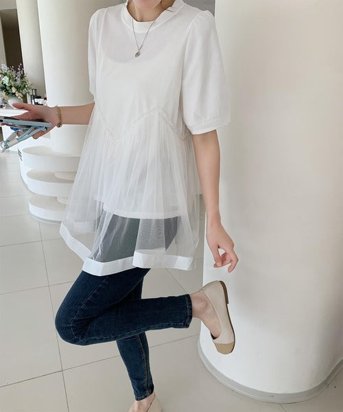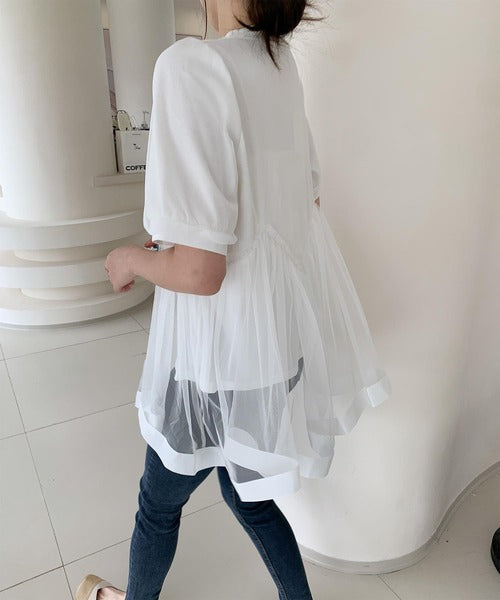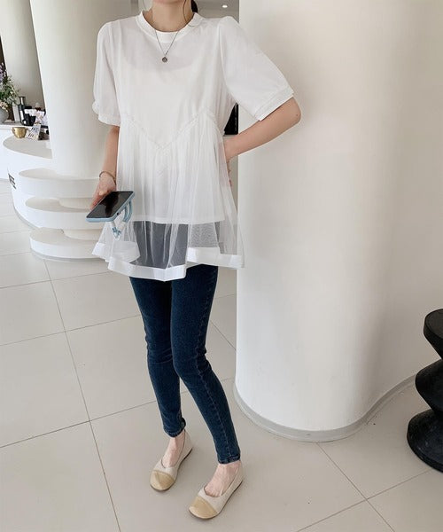 カジュアルなTシャツスタイルに、柔らかなチュール素材をドッキングしたフェミニンな一枚。異素材のコントラストがスタイリングに立体感を与え、動きに合わせてふわりと広がる裾が軽やかで印象的です。