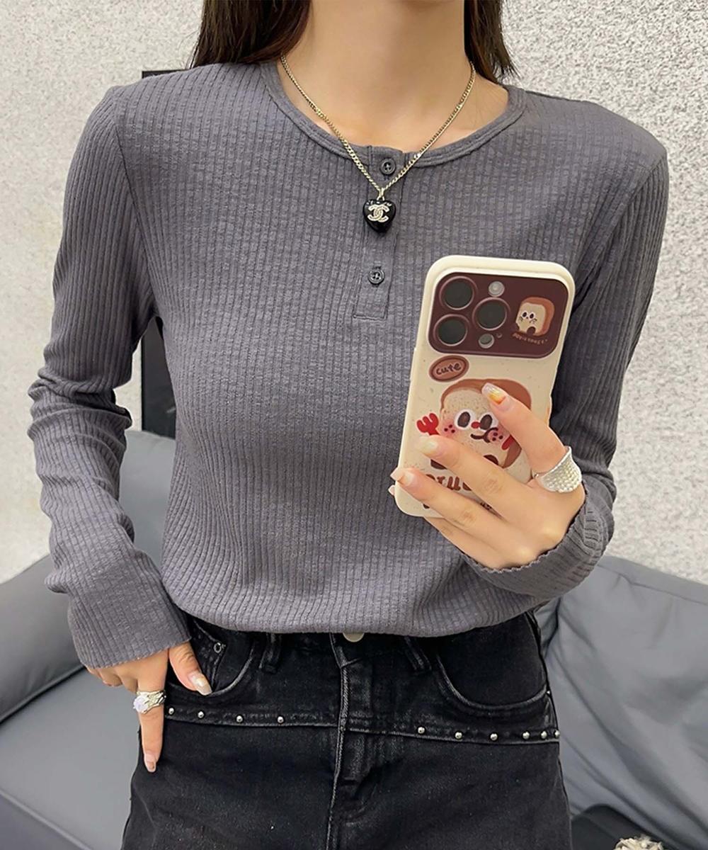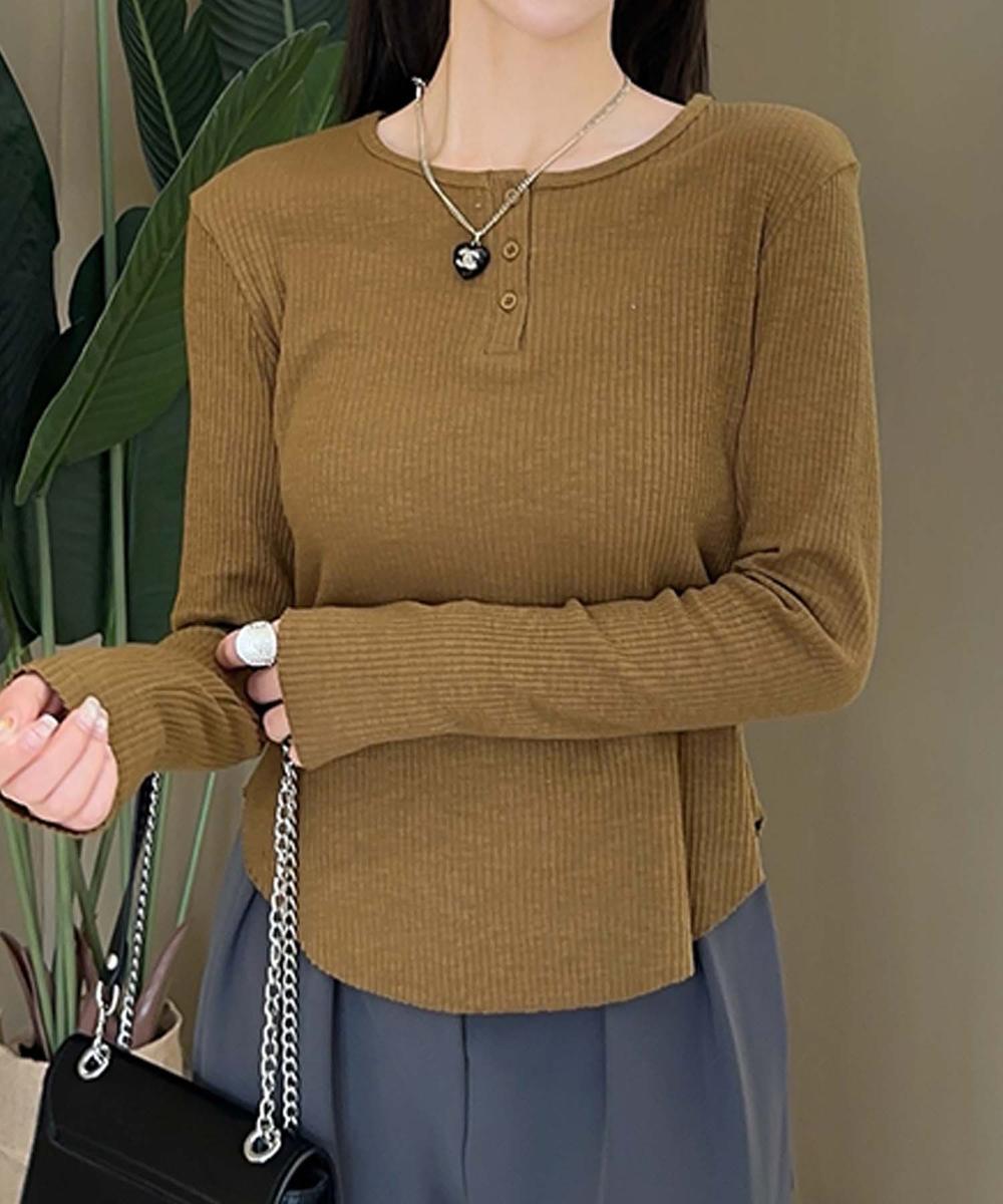 リブ編み素材の長袖Tシャツ、ヘンリーネックのデザインでアクセントを加えたシンプルでありながらおしゃれなアイテム。肌に優しい素材感と細身のシルエットが特徴で、着回し力抜群の1枚です。カジュアルに着こなせるため、デイリーユースにぴったり。