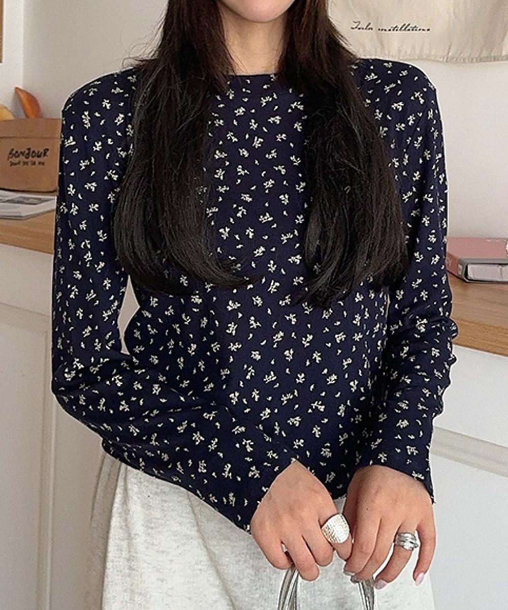 小花柄のプリントが特徴的なシンプルな長袖Tシャツ。日常的に着回しやすく、カジュアルでもあり、どんなコーディネートにもぴったりです。丸襟のデザインと、柔らかな生地感で、着心地も快適です。