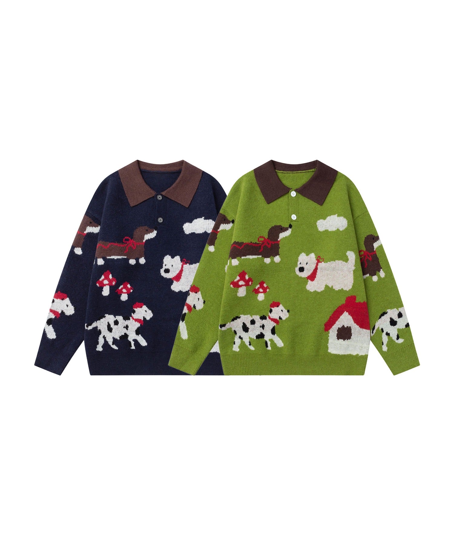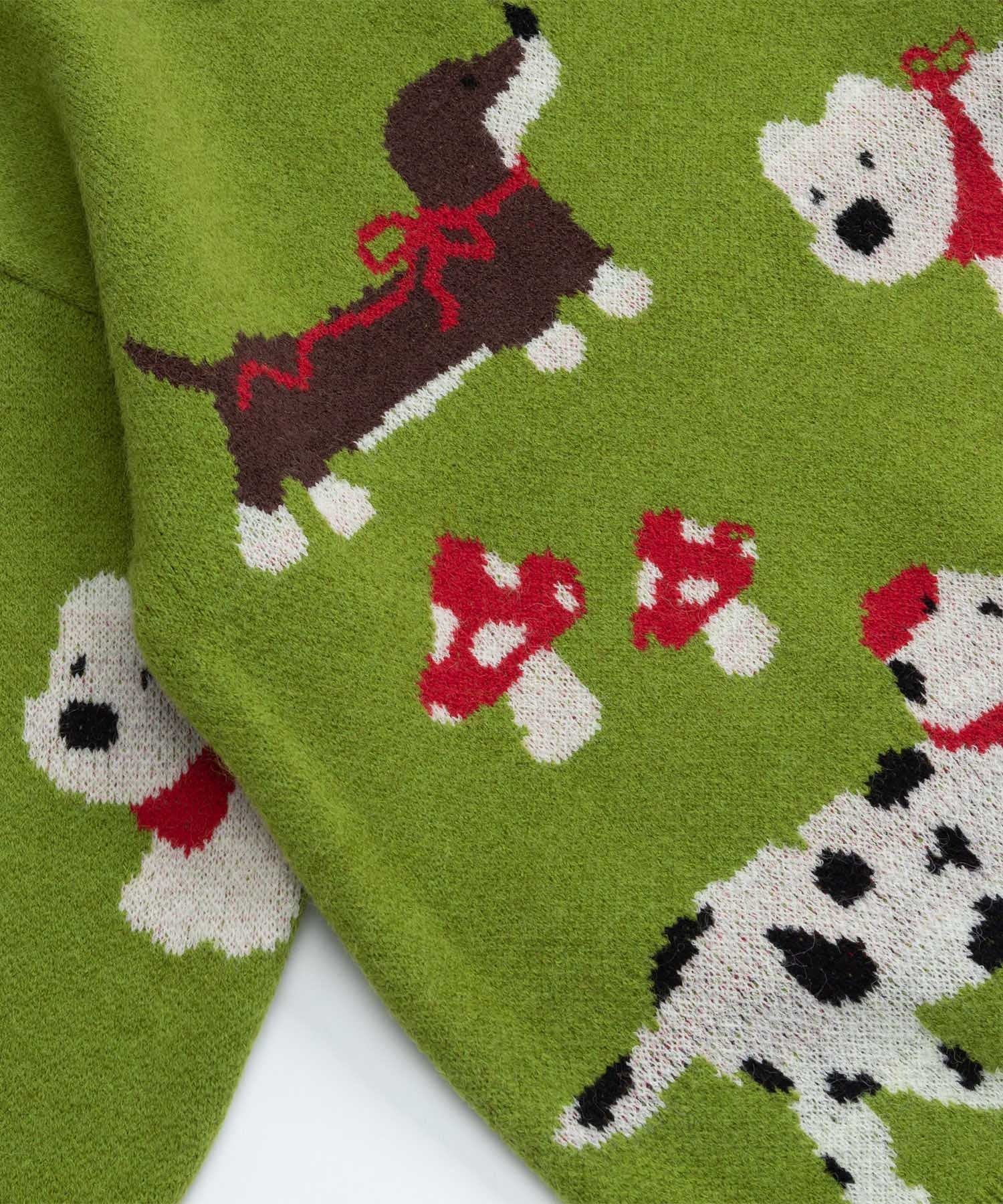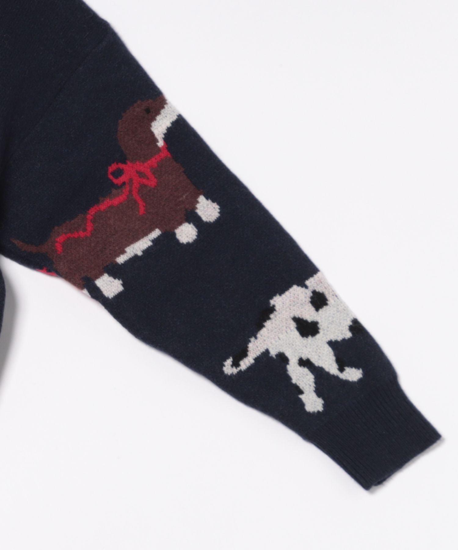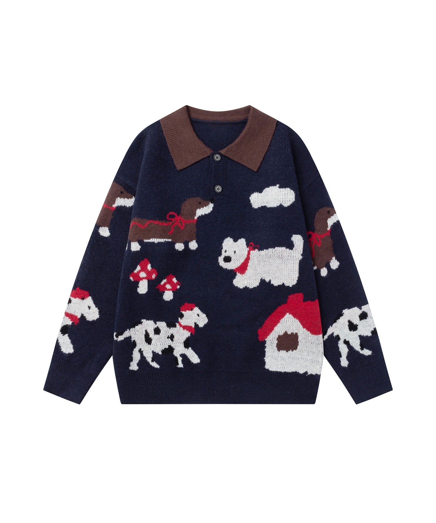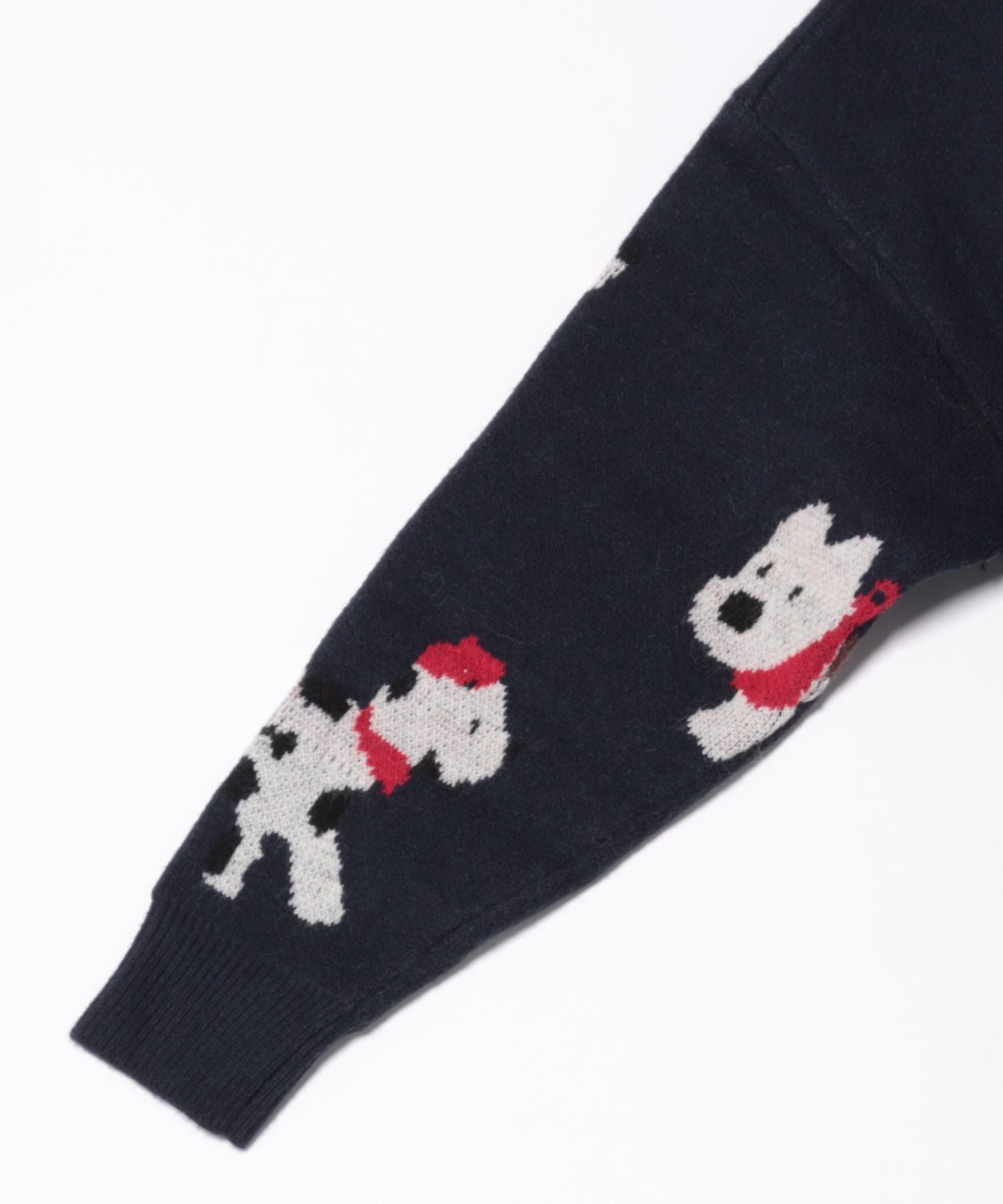 クラシカルなポロ襟デザインに、キュートな“わんちゃん柄”を大胆にあしらった遊び心あふれるニット。