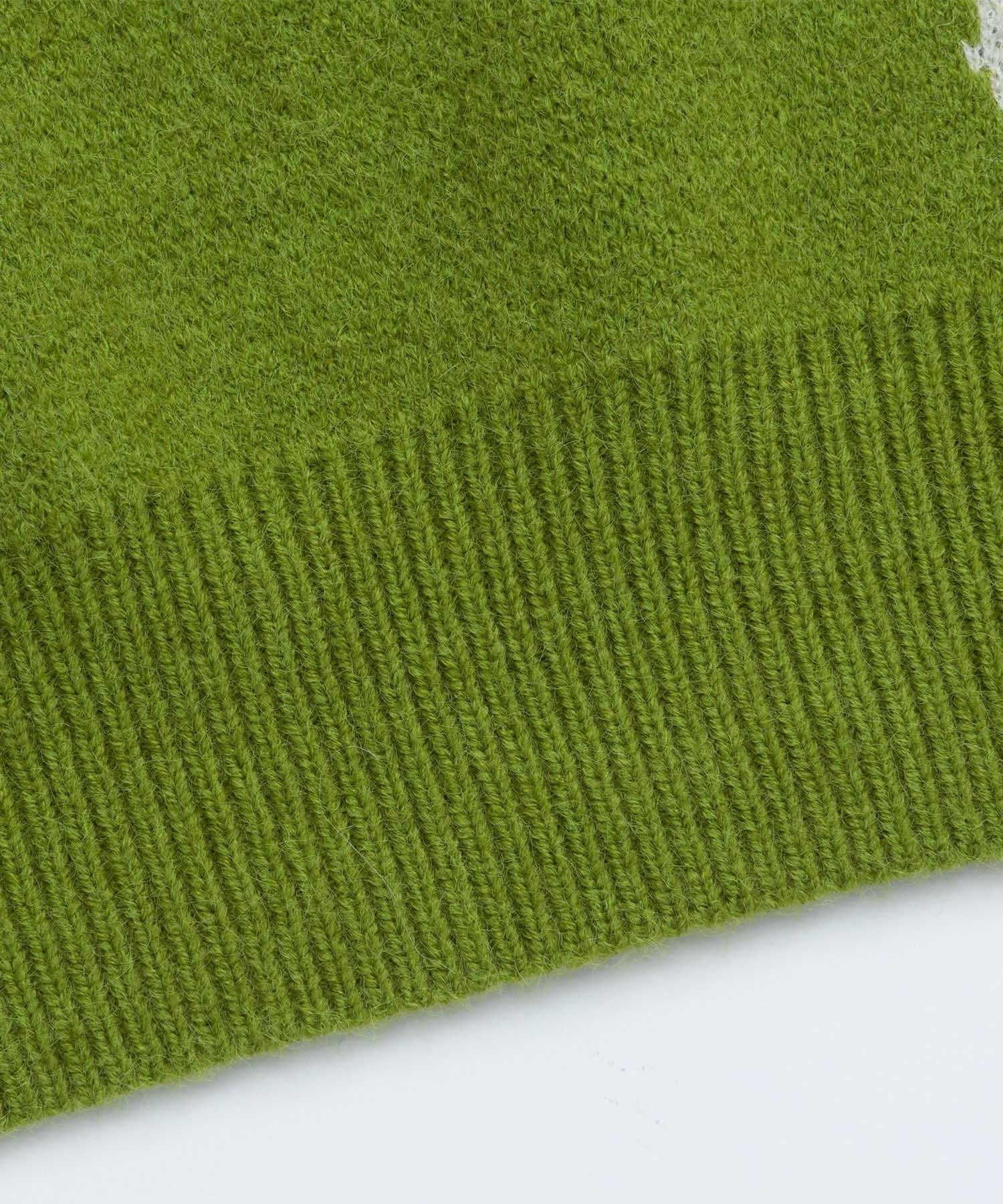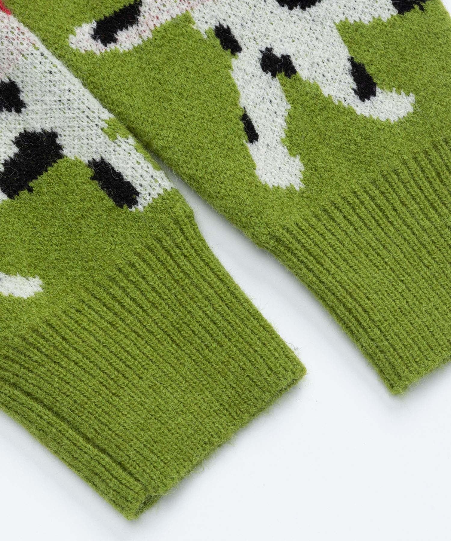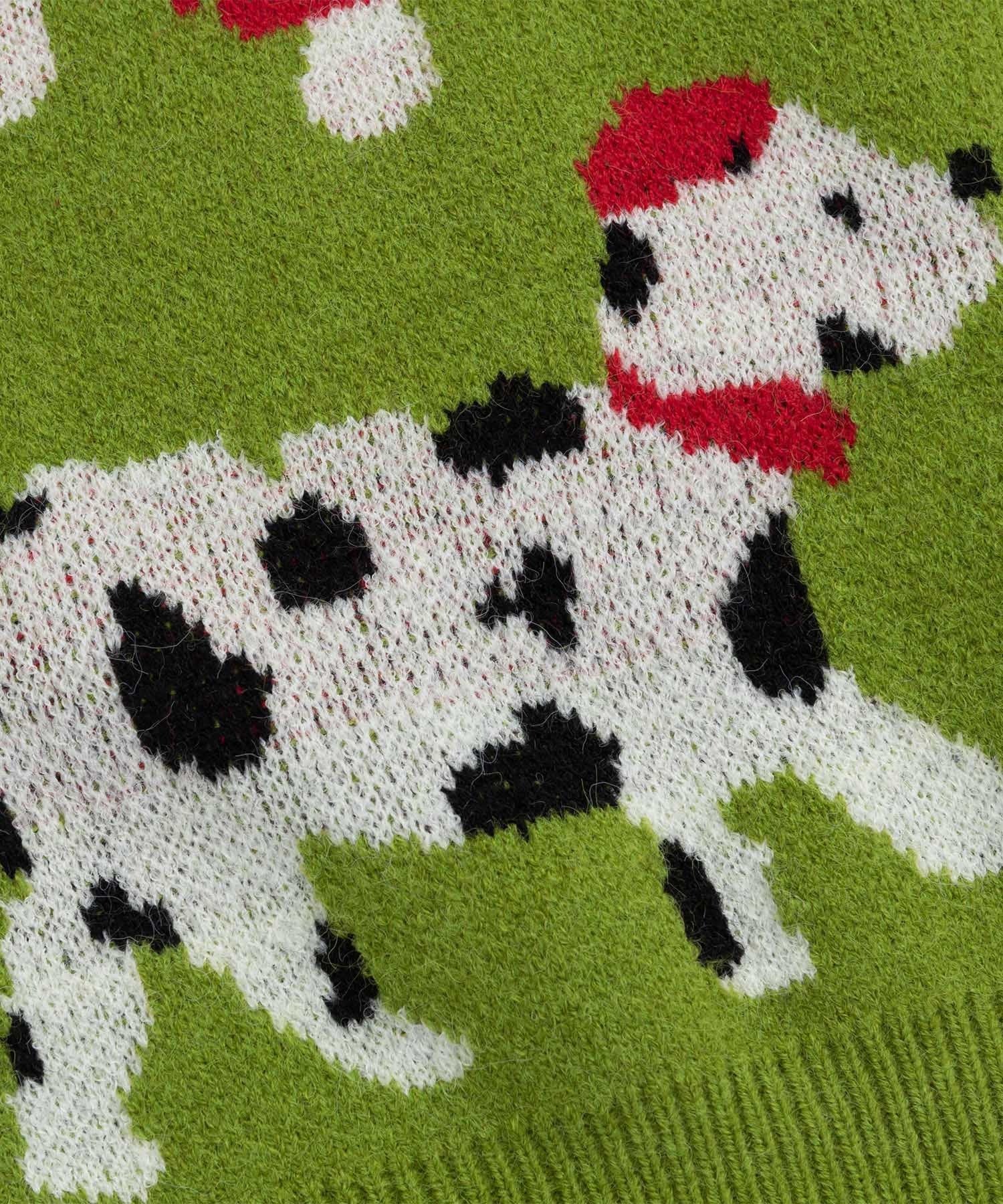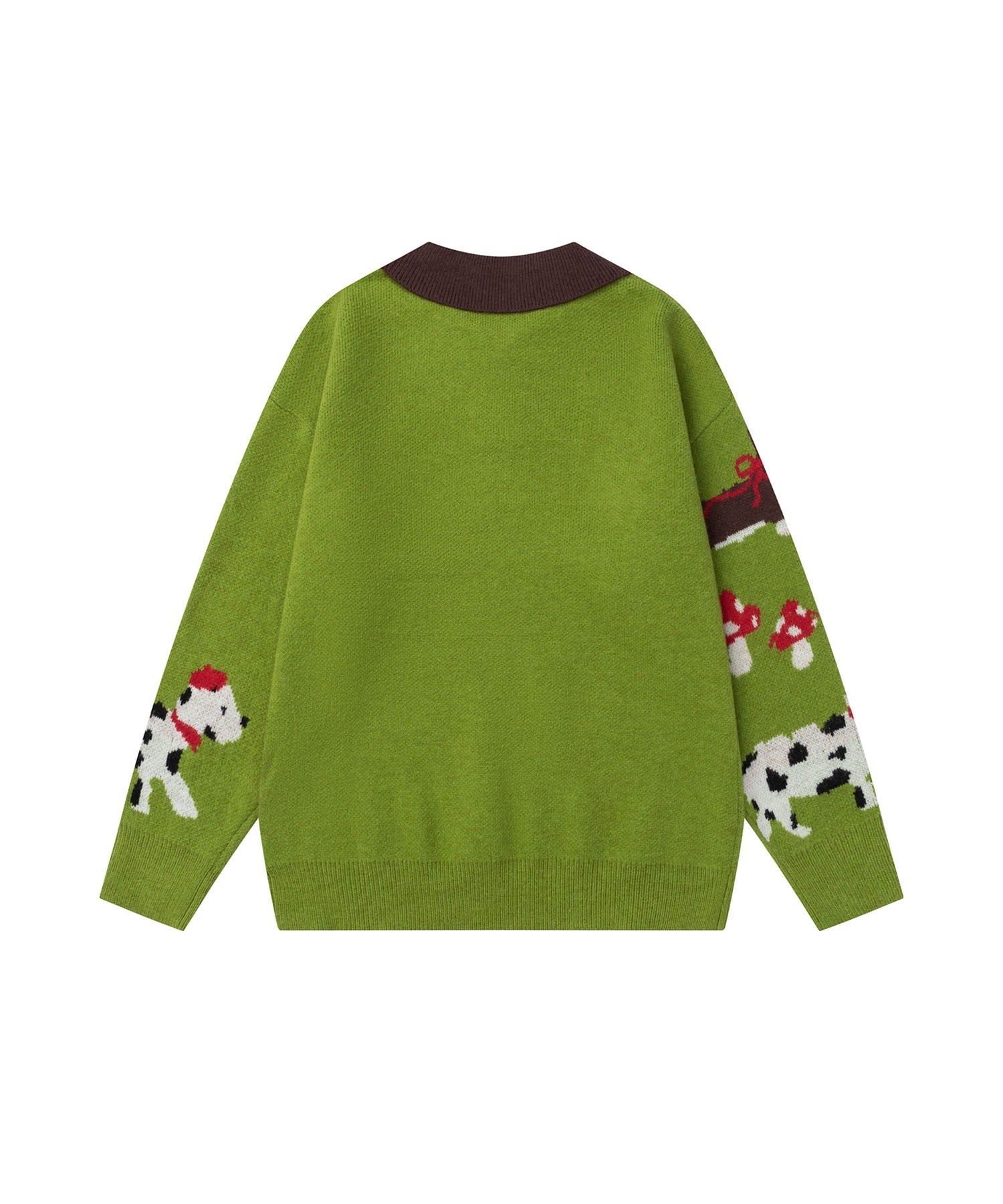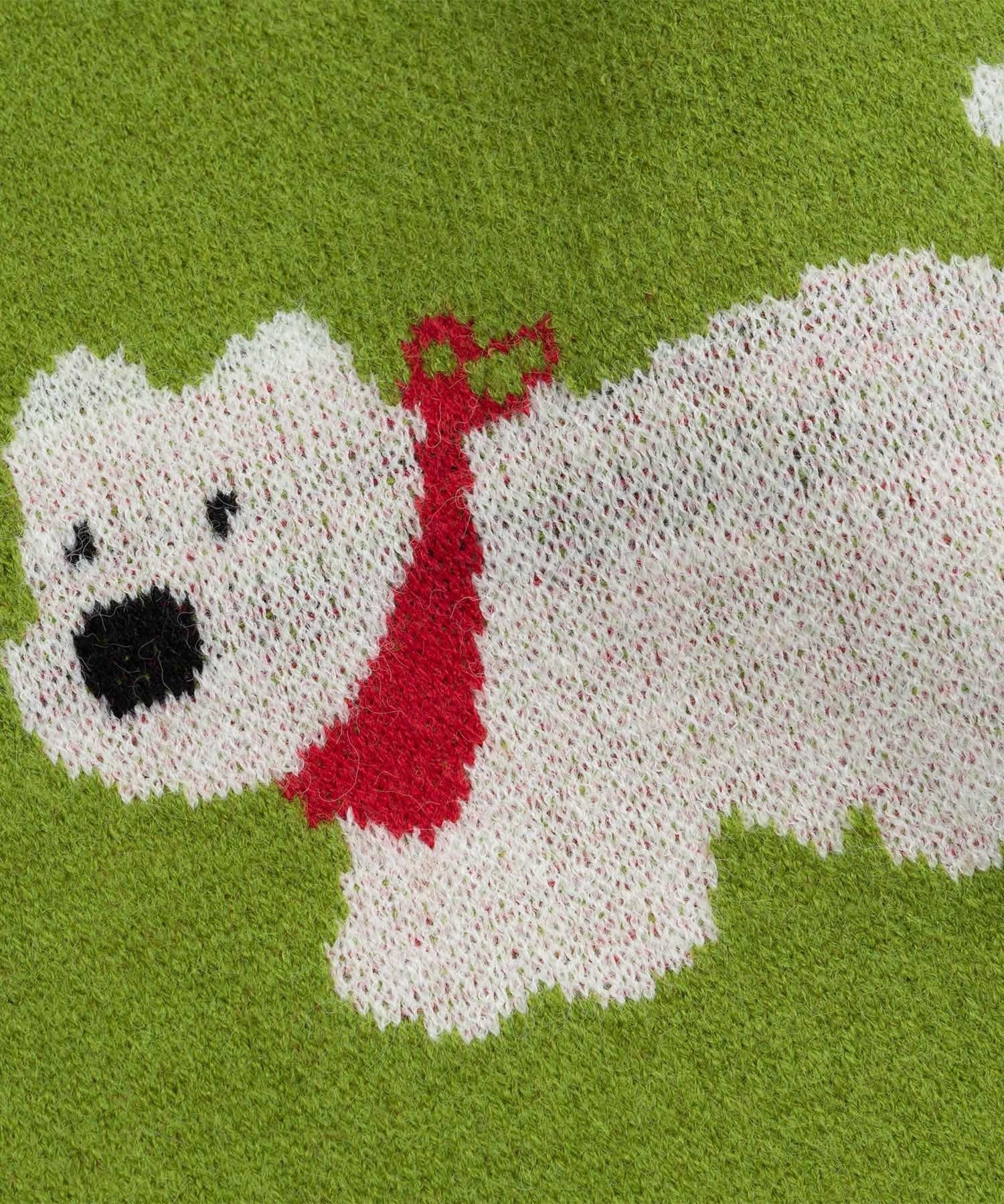 クラシカルなポロ襟デザインに、キュートな“わんちゃん柄”を大胆にあしらった遊び心あふれるニット。